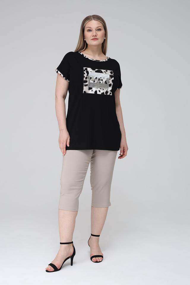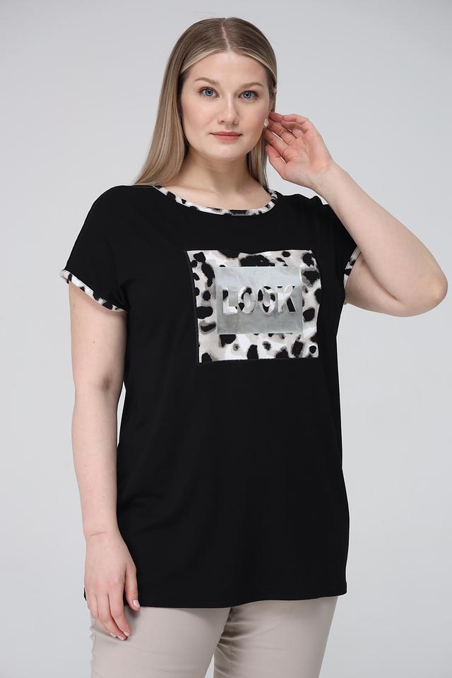 Женская футболка Doris Streich чёрного цвета с оригинальным принтом "LOOK" и отделкой горловины и рукавов в леопардовый принт. Модель свободного кроя из мягкой вискозы обеспечит комфорт в течение дня. Состав: вискоза 92%, эластан 8%