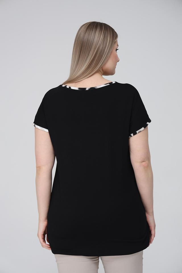 Особенности модели: свободный крой, короткие рукава с отделкой в леопардовый принт, округлый вырез горловины, также отделанный леопардовым принтом. Футболка выполнена из приятной к телу вискозы с добавлением эластана, что обеспечивает комфорт при носке и сохранение формы.