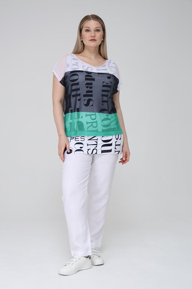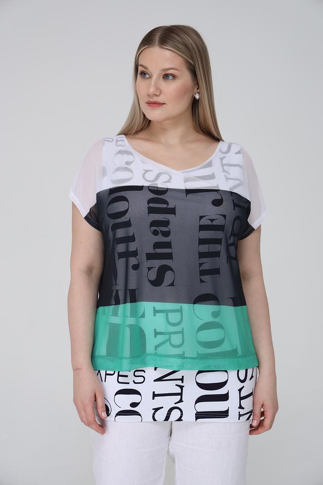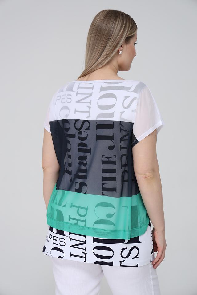 Женская футболка Doris Streich зеленого, серого и белого цветов с ярким графическим принтом. Модель свободного кроя выполнена из мягкого полиэстера с добавлением эластана для комфорта и свободы движений. Состав: полиэстер 95%, эластан 5%