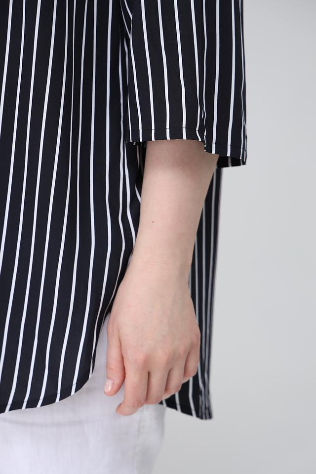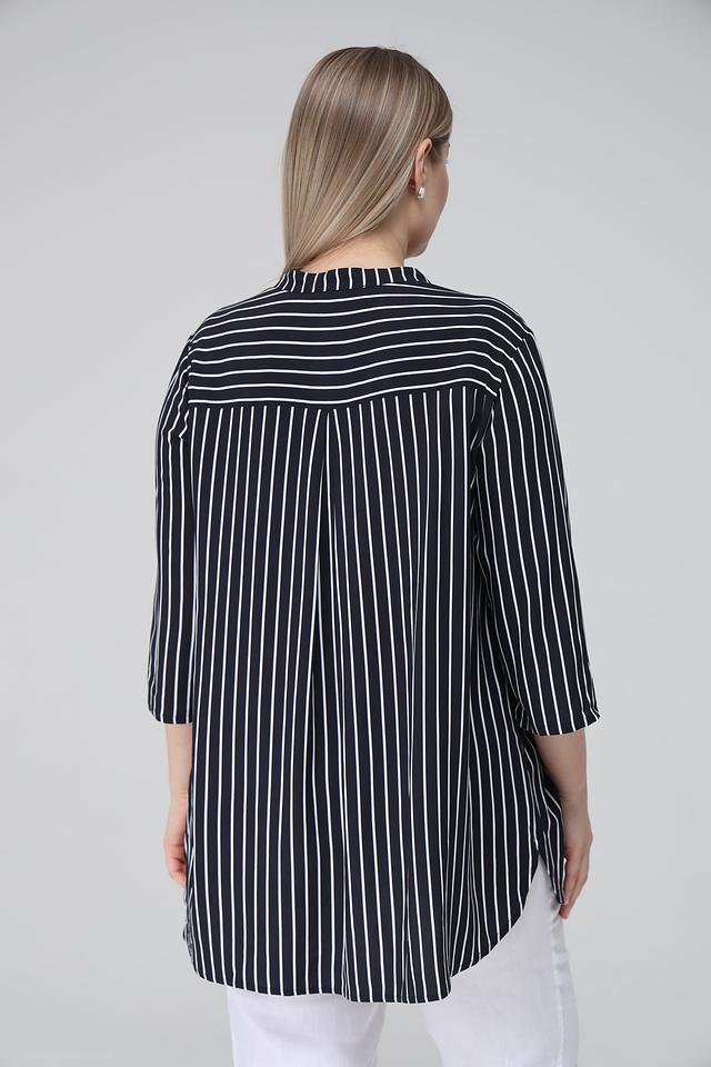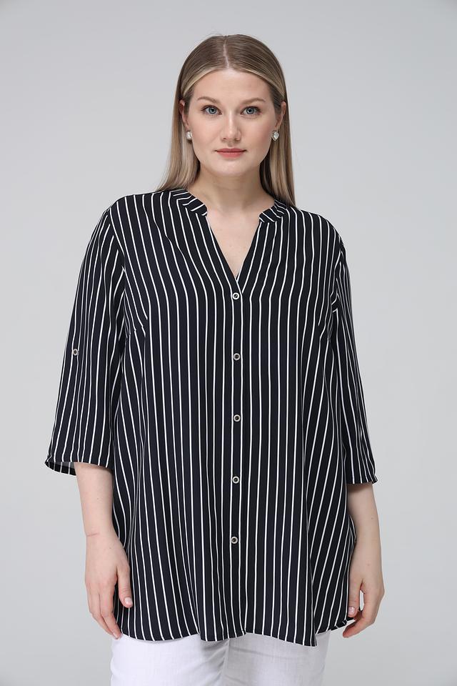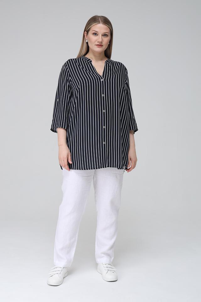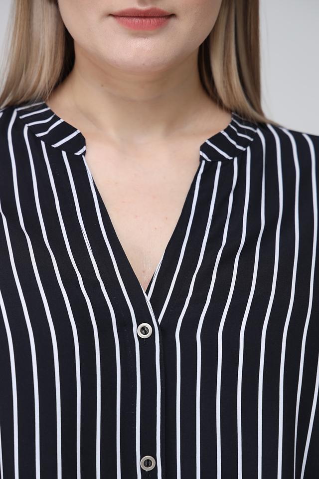Блуза имеет классический крой с V-образным вырезом и застежкой на пуговицы. Вертикальная полоска визуально вытягивает силуэт и делает образ более стройным.