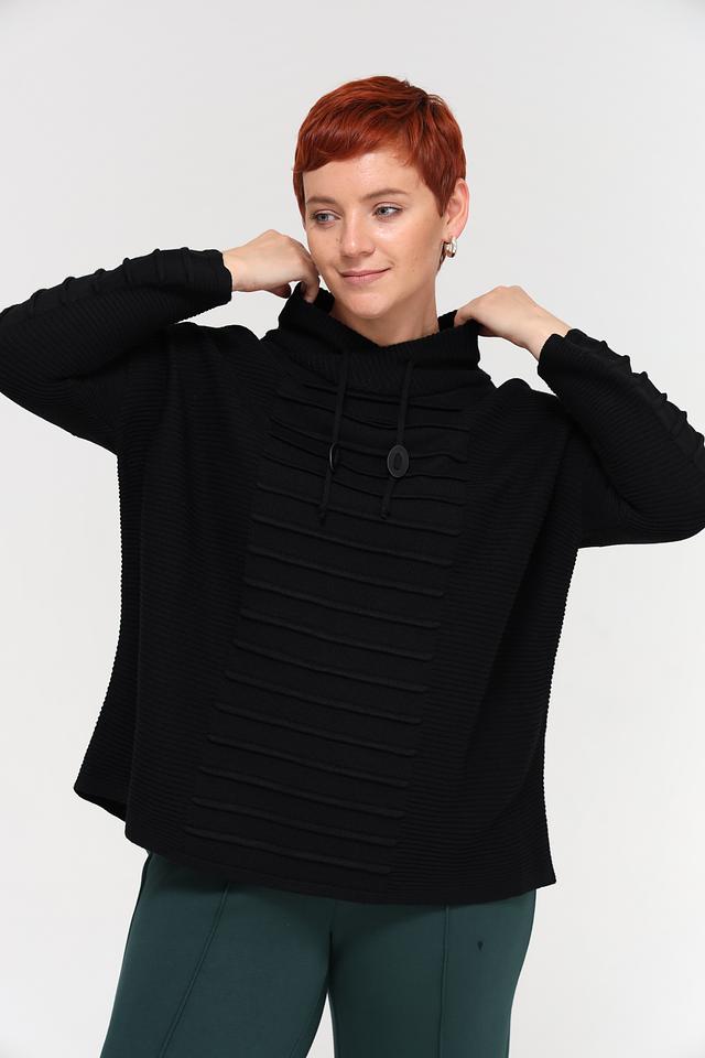 Пуловер имеет свободный крой, который не сковывает движений. Особое внимание привлекает текстурная вязка, создающая интересный визуальный эффект. Декоративные шнурки с пуговицами добавляют оригинальности и позволяют регулировать вырез горловины.