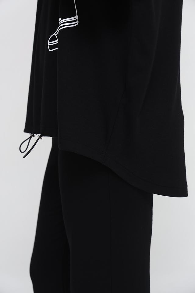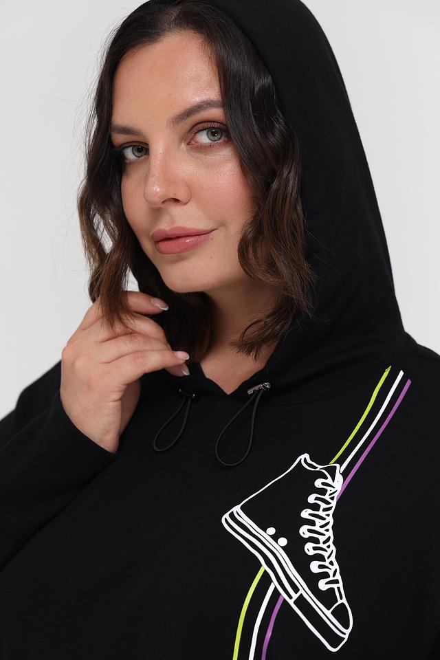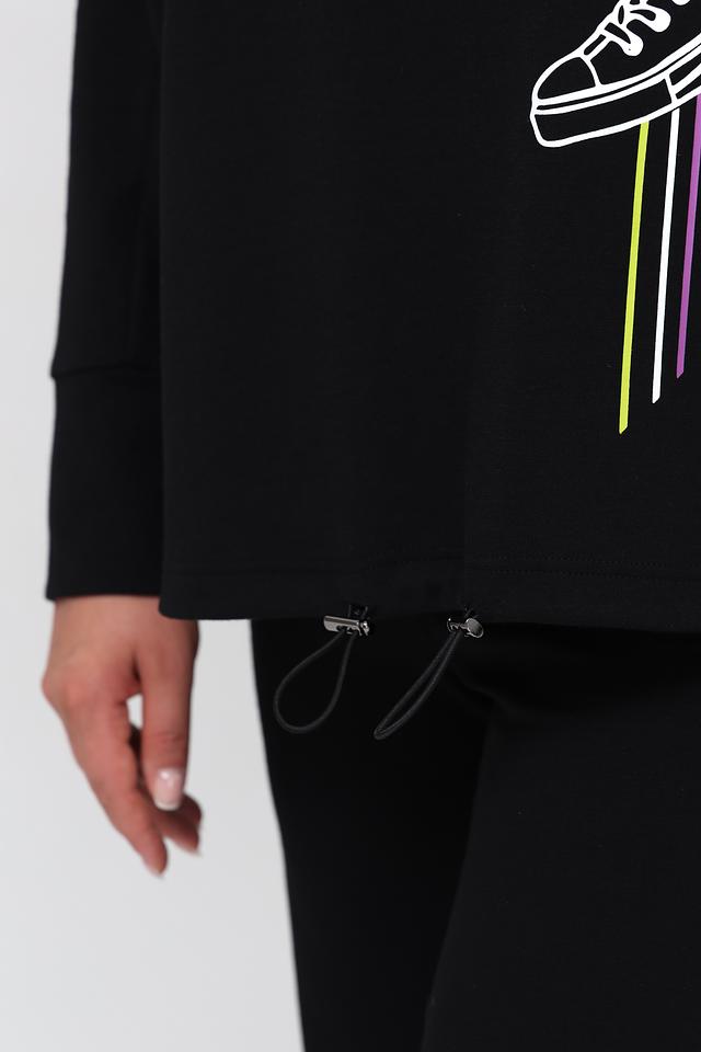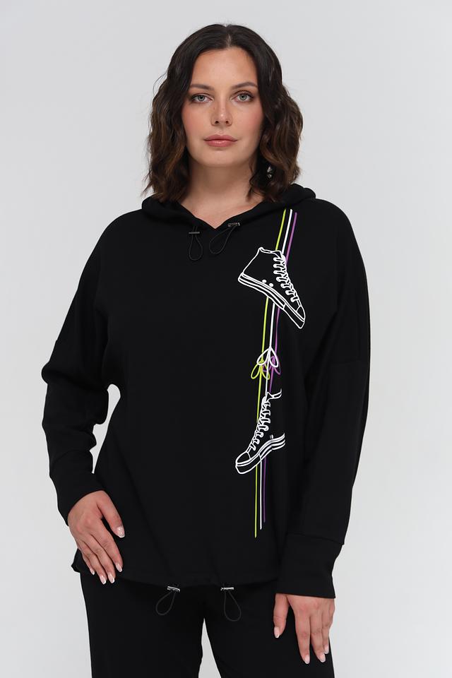 Чёрный пуловер от Doris Streich с оригинальным принтом в виде кроссовок. Модель выполнена из мягкого и приятного к телу сочетания хлопка и модала, обеспечивая комфорт в носке. Удобный капюшон и свободный крой делают этот пуловер идеальным выбором для повседневного образа. Состав: хлопок 49%, модал 49%, эластан 2%