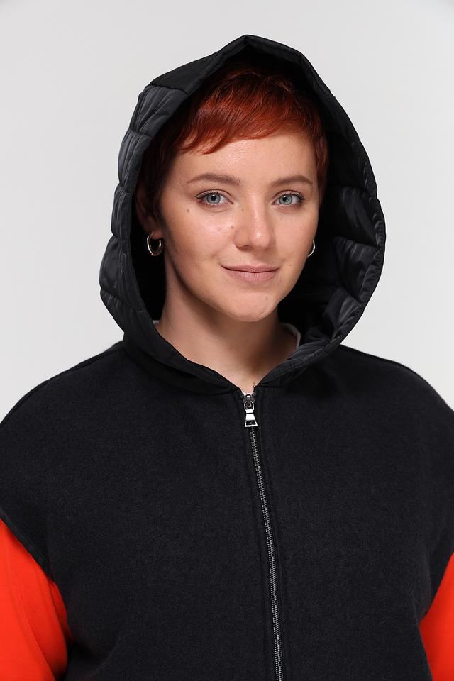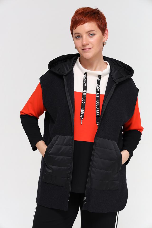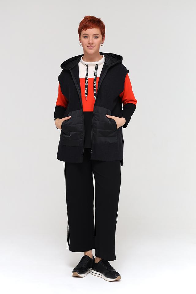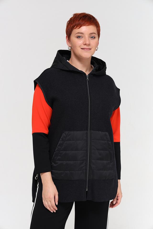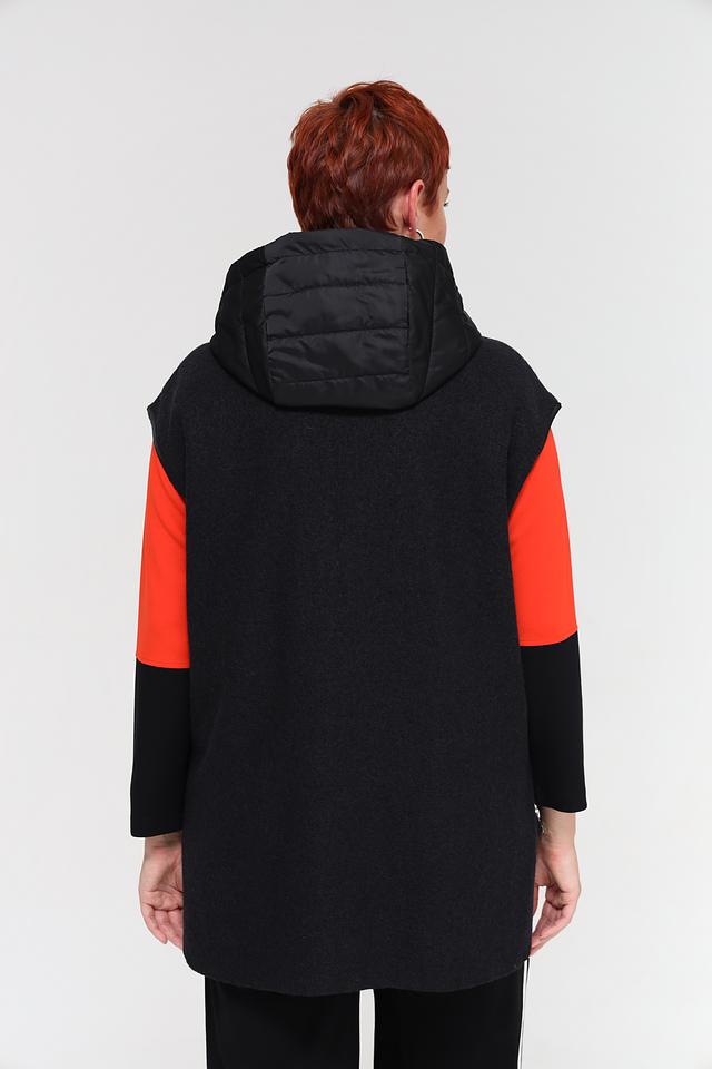 Жилет выполнен в черном цвете с контрастными вставками из стеганой ткани и яркого оранжевого материала. Модель имеет удобный капюшон и застегивается на молнию. Боковые карманы обеспечивают функциональность.