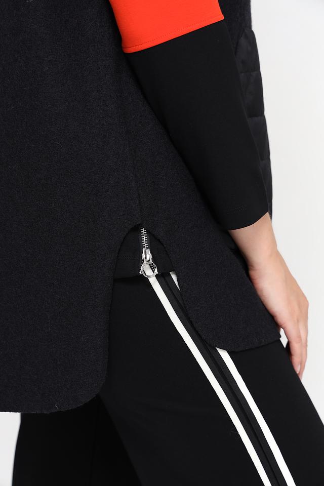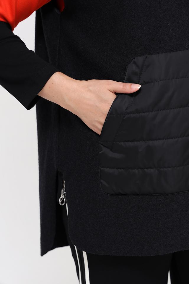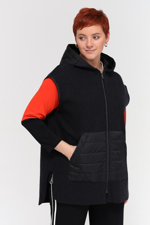 Стильный жилет Doris Streich черного цвета с комбинированным дизайном – идеальное решение для создания многослойных образов. Модель выполнена из шерсти и вискозы, имеет стеганые вставки и капюшон. Состав: шерсть 60%, вискоза 40%