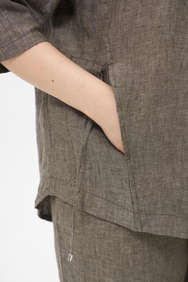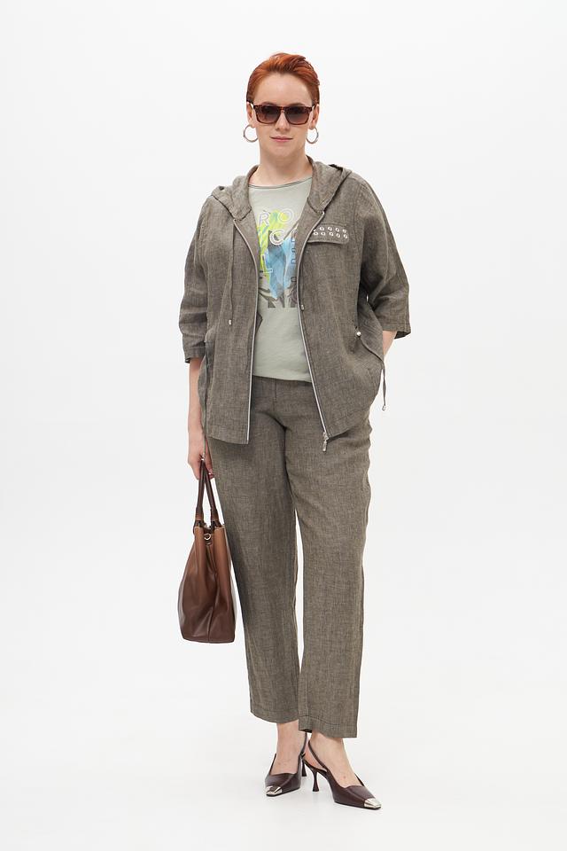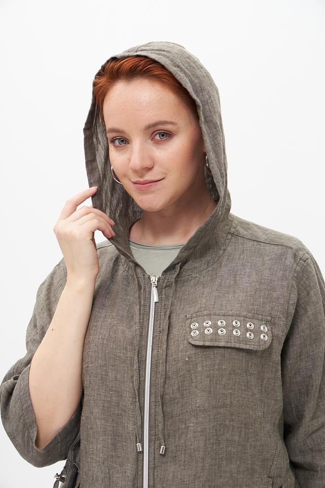 Серый льняной жакет от Doris Streich с капюшоном и застежкой-молнией. Изготовлен из 100% льна, что обеспечивает комфорт и воздухопроницаемость в теплую погоду. Оригинальный дизайн с декоративной отделкой. Состав: лен 100%