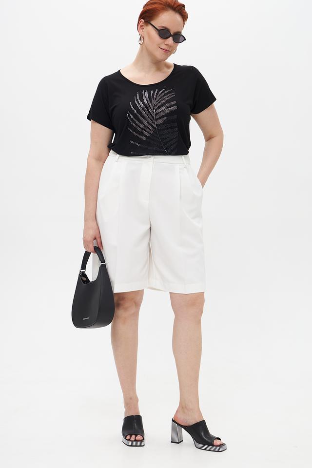 Дизайн футболки дополняет аппликация в виде пальмового листа, выполненная из мелких страз, придающая образу изысканность и привлекательность. Круглый вырез горловины и короткий рукав делают модель универсальной и подходящей для различных типов фигуры. Свободный крой футболки не сковывает движения, а асимметричный низ добавляет оригинальности.