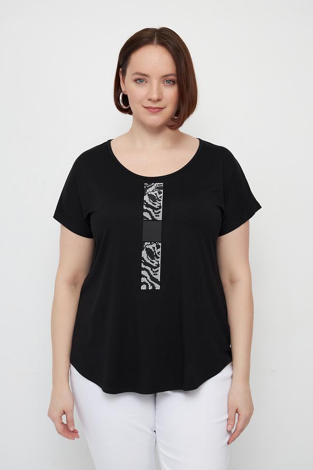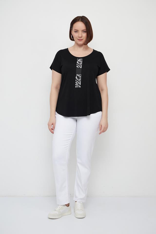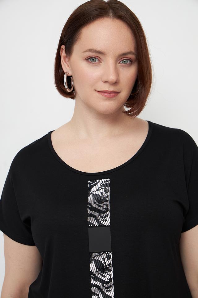 Основная особенность этой модели – вертикальная полоса из мерцающих страз, которая придает образу изысканность и привлекает внимание. Футболка изготовлена из высококачественной вискозы с добавлением эластана, что обеспечивает мягкость, приятные тактильные ощущения и хорошую посадку по фигуре.