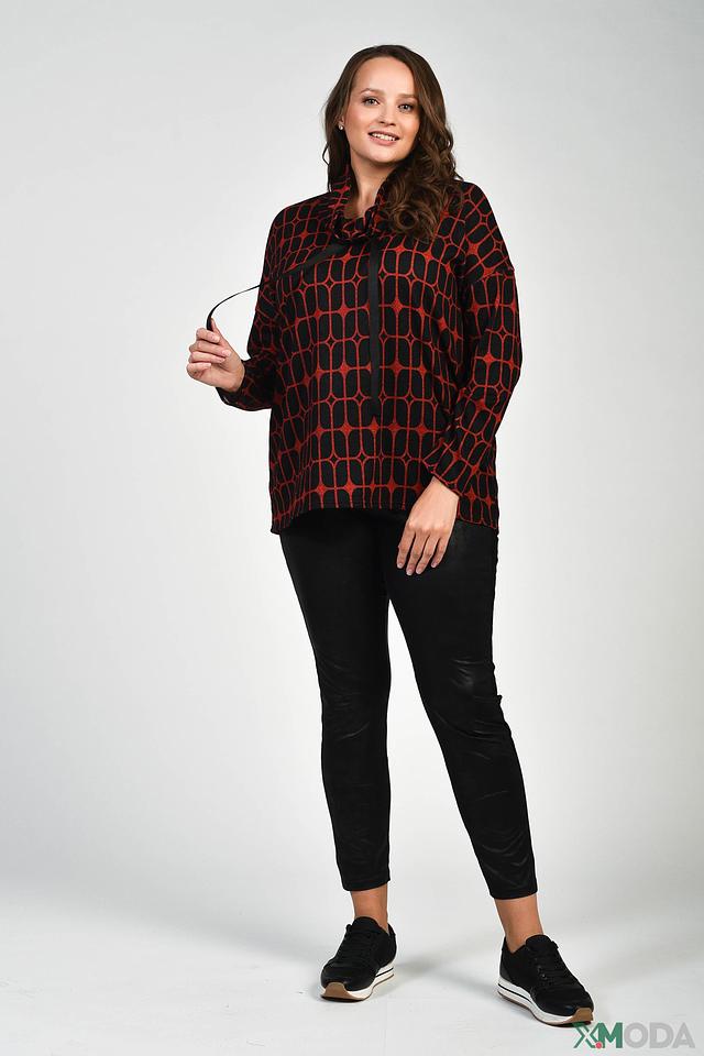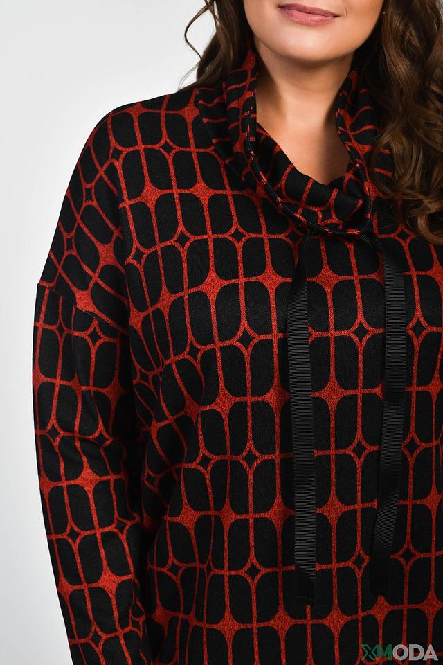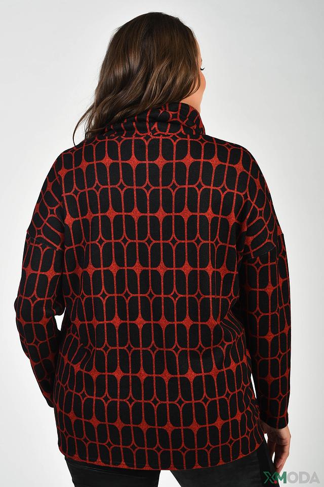 Особенностью данной модели является яркий геометрический принт в красных и черных тонах, который делает ее запоминающейся и привлекательной. Пуловер идеально подойдет для создания повседневных и вечерних образов. Он хорошо сочетается с джинсами, брюками и юбками.
