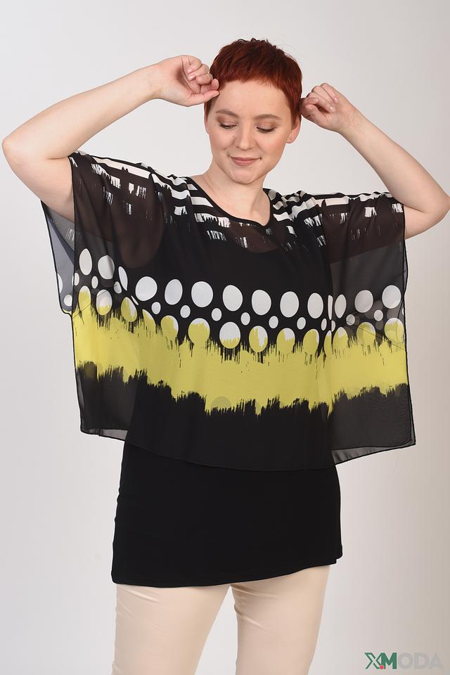 Эта стильная блуза от бренда Doris Streich станет отличным дополнением к вашему гардеробу. Блуза выполнена в чёрном цвете с ярким и необычным принтом, сочетающим в себе горошек и абстрактные мазки жёлтого и белого цветов.