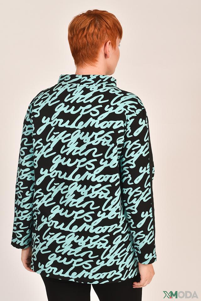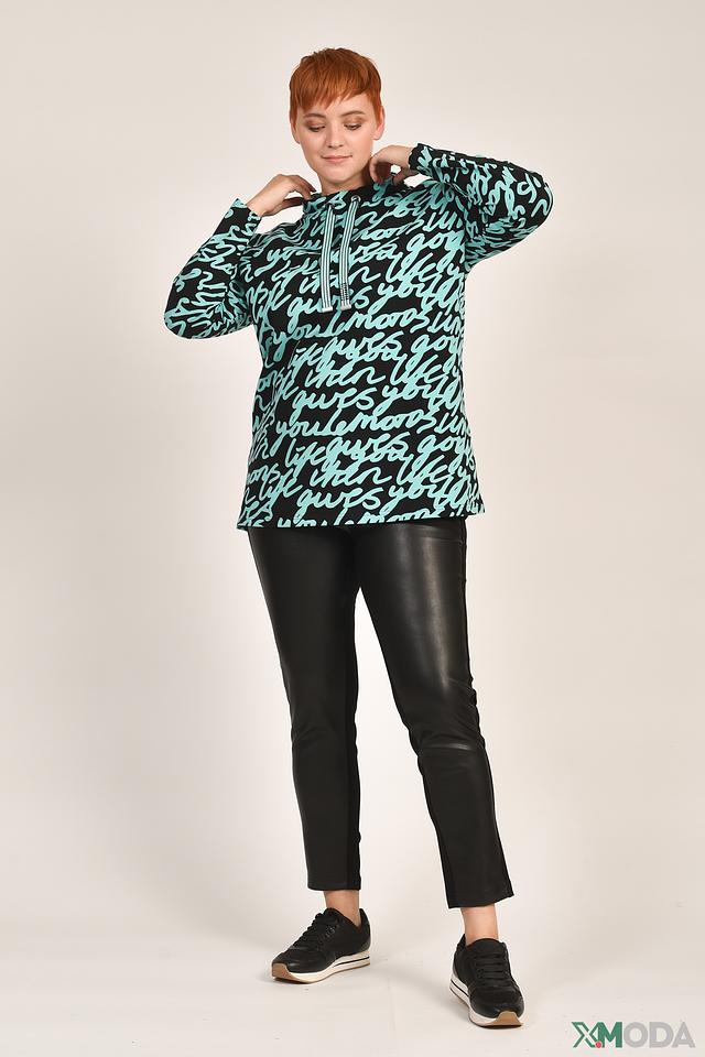 Пуловер имеет свободный крой и длинные рукава. Главная особенность модели – эффектный принт, состоящий из повторяющихся надписей на чёрном фоне. Вырез горловины оформлен в виде капюшона, дополненного шнурком для регулировки.