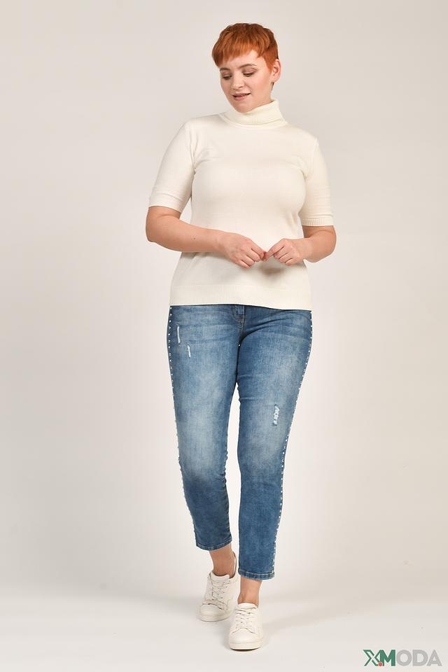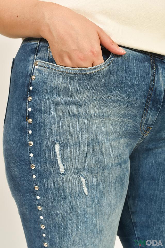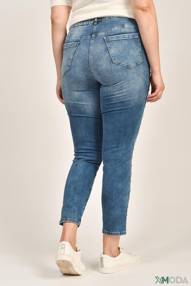 Джинсы от бренда Doris Streich выполнены в голубом цвете с выраженным эффектом потертостей и искусственно состаренной текстурой. Модель отличается оригинальным дизайном, дополненным декоративными металлическими элементами вдоль одной штанины.