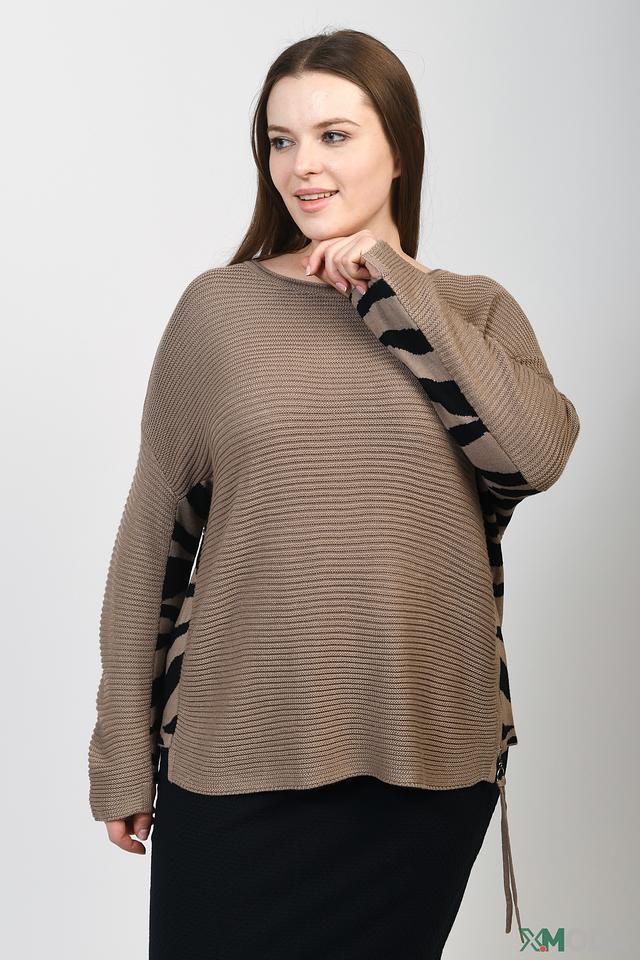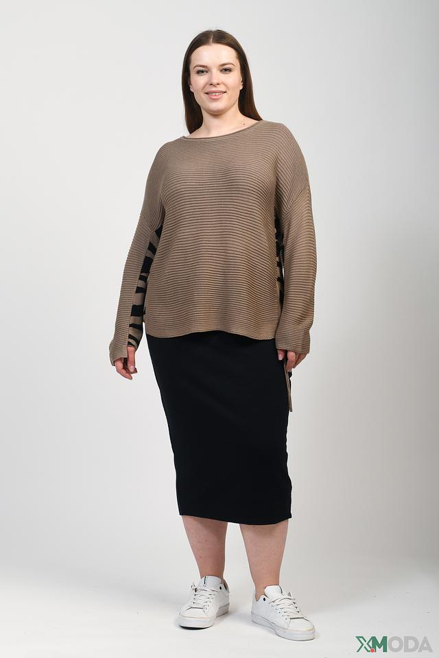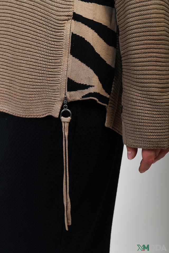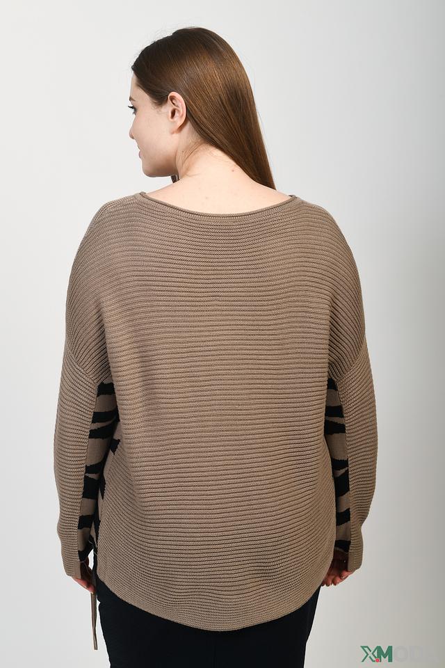 Особенностью модели являются рукава с оригинальным принтом, добавляющим образу динамичности. Асимметричный низ пуловера создает интересный силуэт. Пуловер имеет круглый вырез горловины.
