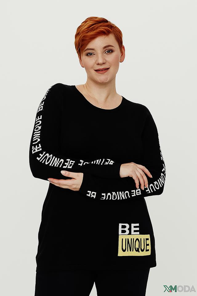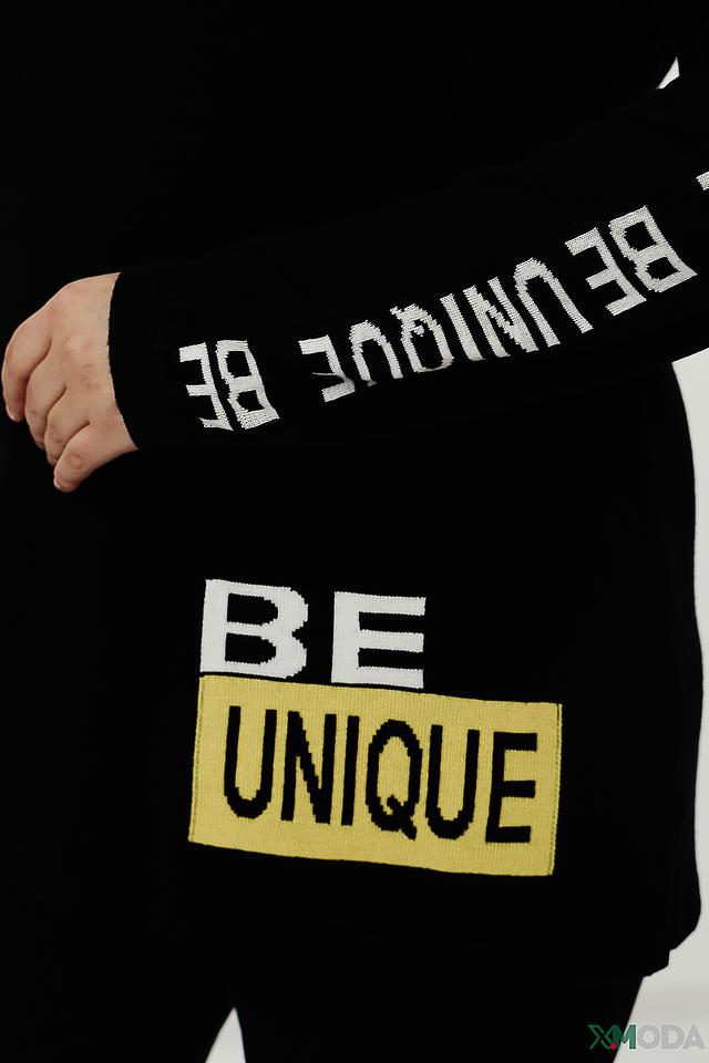 Пуловер имеет свободный крой, который не сковывает движений и позволяет создать расслабленный образ. Особенностью модели является яркий принт "BE UNIQUE" на лицевой стороне и вдоль рукавов, выполненный в белом и жёлтом цветах, что добавляет индивидуальности и стиля.
