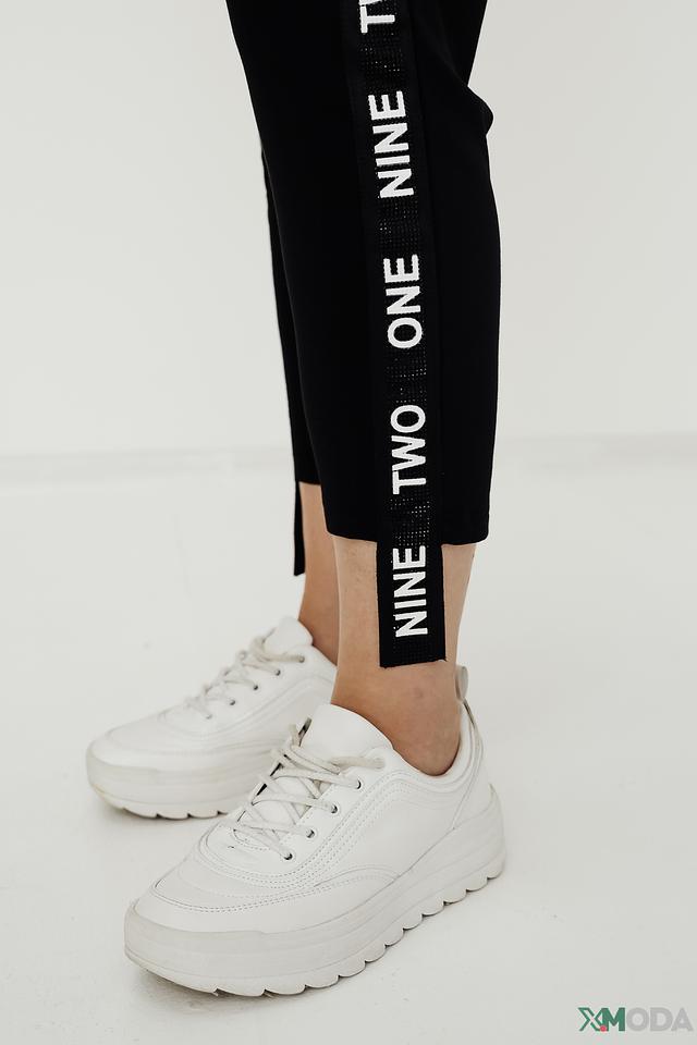 Особенностью данной модели является декоративная полоса с надписью "NINE TWO ONE", расположенная по боковой части брюк. Пояс дополнен шнурком с металлическими наконечниками, что позволяет регулировать посадку. Брюки имеют манжеты внизу, что придает им более современный и спортивный вид.