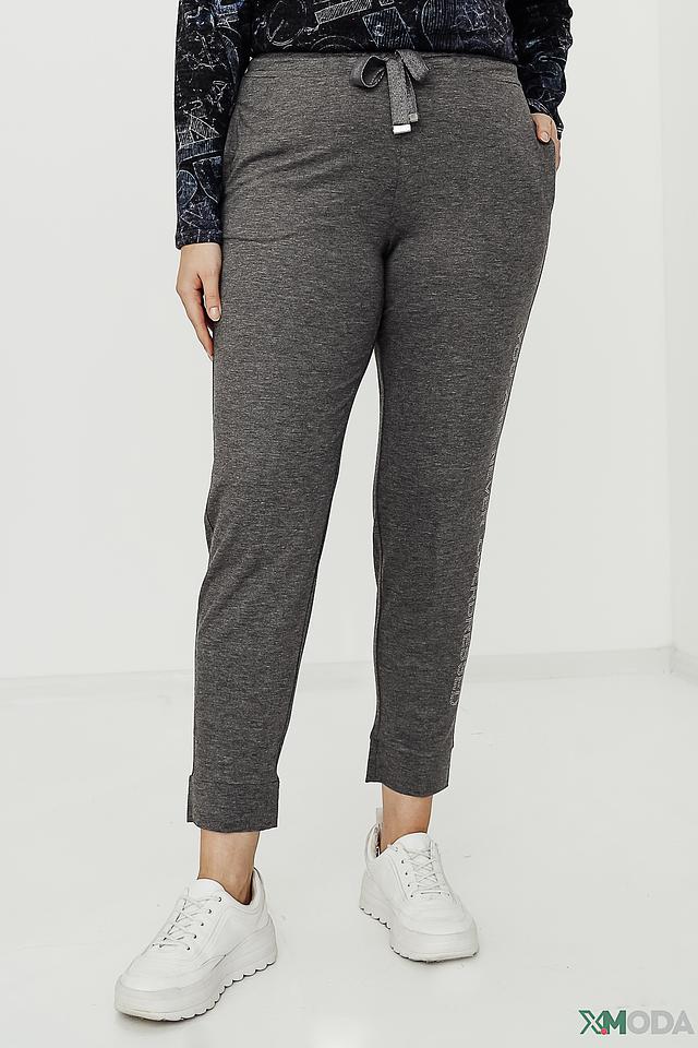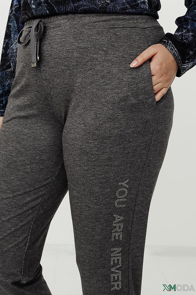 Модель имеет удобный эластичный пояс с кулиской, которая позволяет регулировать посадку по талии. Брюки заужены к низу, что придает им современный и элегантный вид. На левой штанине расположена декоративная надпись, выполненная в виде страз, что добавляет брюкам изюминку.