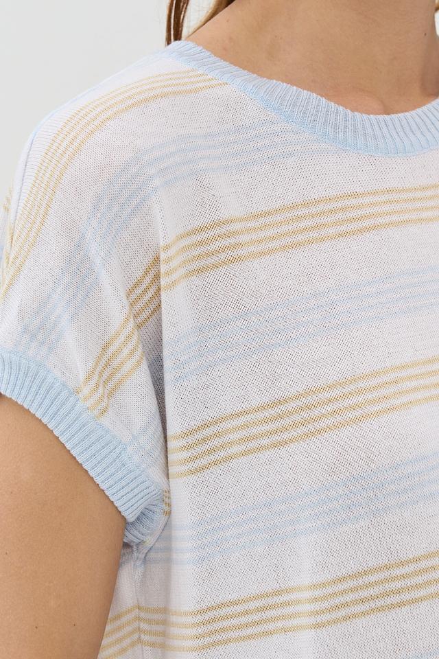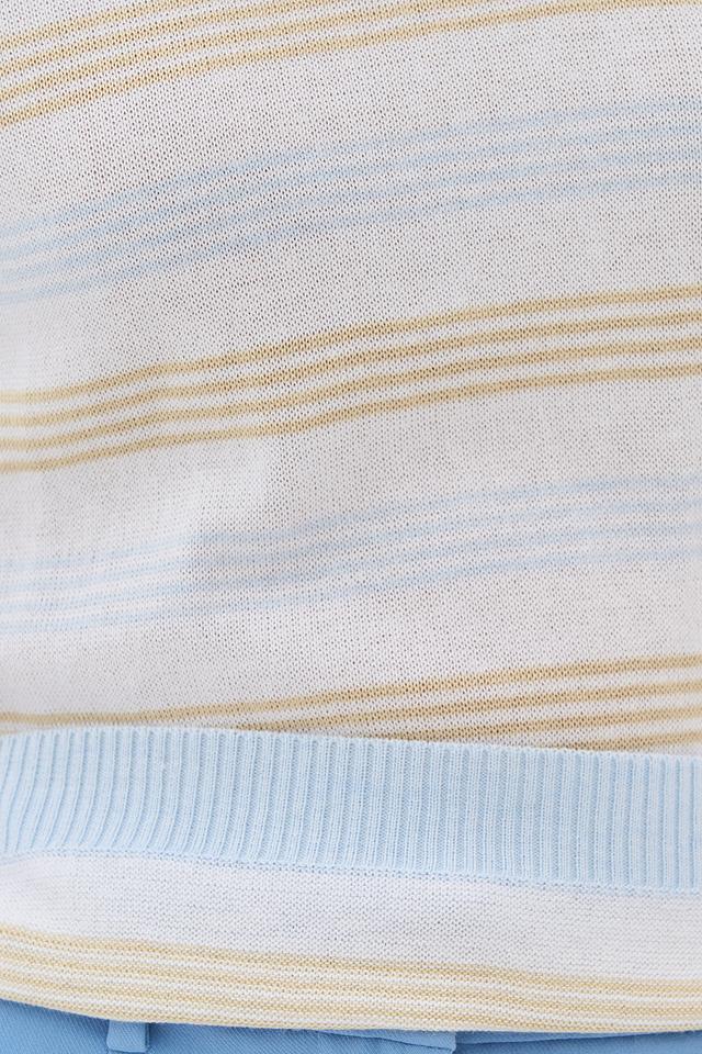 Представляем вашему вниманию стильный джемпер от бренда BE YOU. Модель выполнена в светло-голубой цветовой гамме и украшена горизонтальными полосами бежевого и белого цветов.