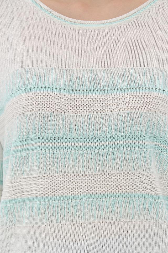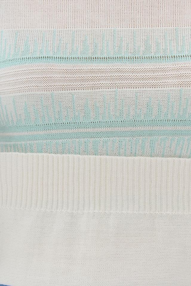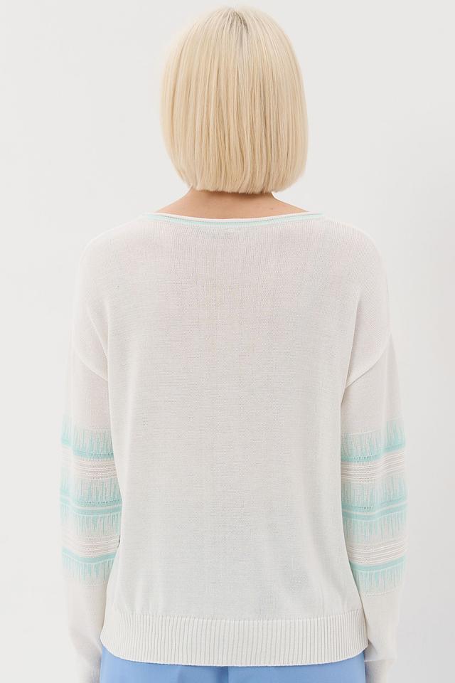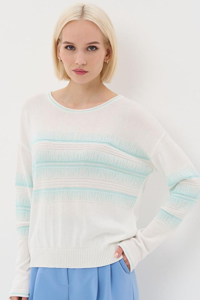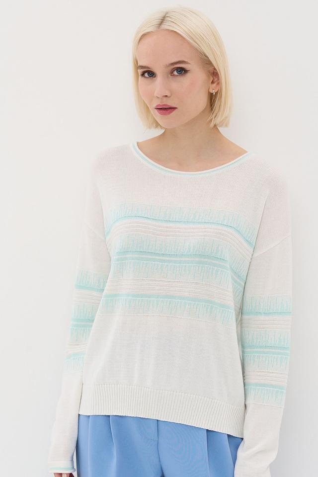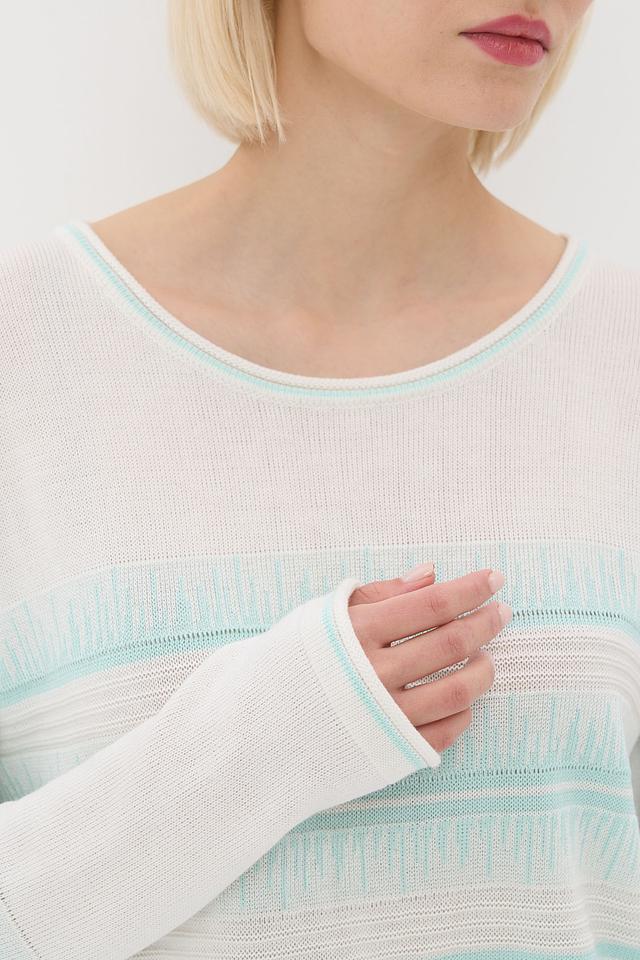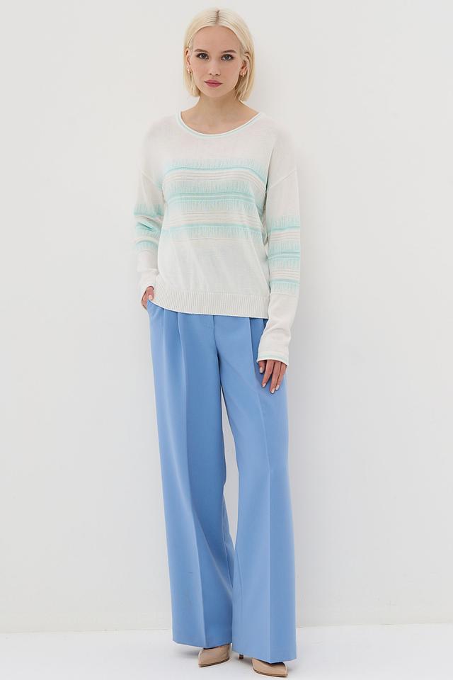 Представляем стильный джемпер от бренда BE YOU. Изделие выполнено в белом цвете и украшено горизонтальными полосками голубого оттенка.