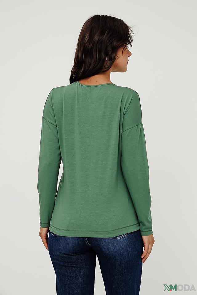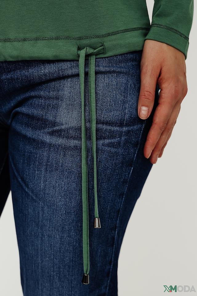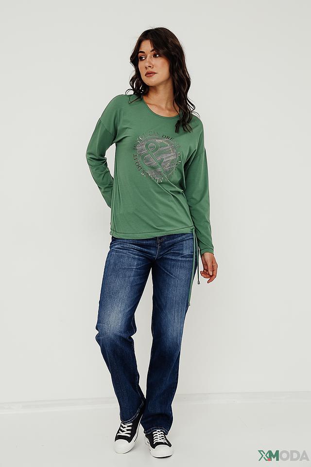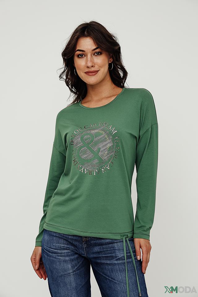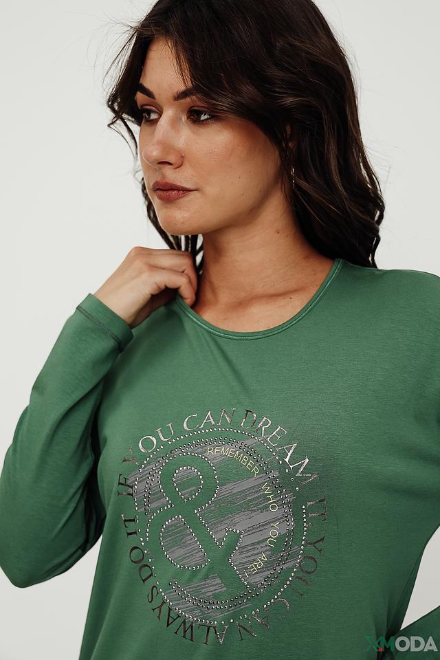 Зелёный джемпер от Bianca с оригинальным принтом и декоративными элементами. Изготовлен из мягкого и приятного к телу сочетания хлопка и модала, обеспечивающего комфорт в носке. Состав: хлопок 48%, модал 48%, эластан 4%
