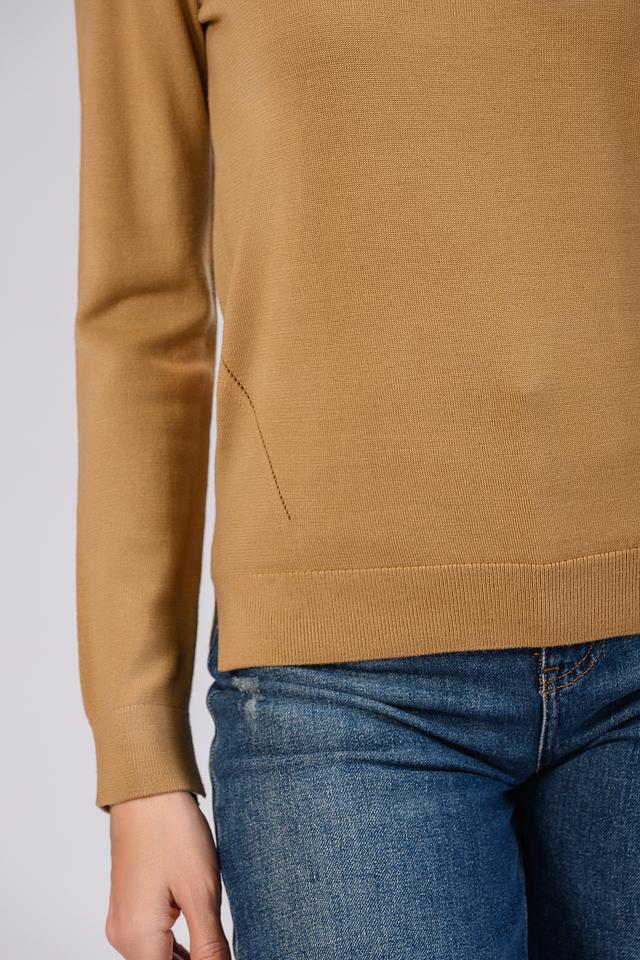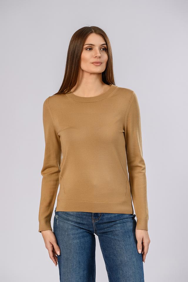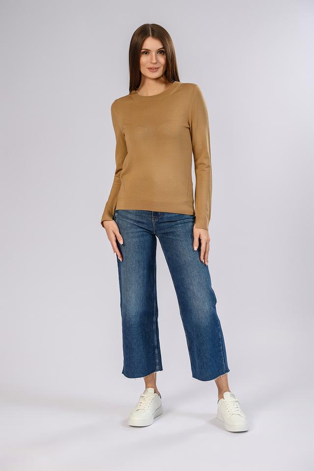 Джемпер имеет классический круглый вырез горловины и прямой крой, который подчеркивает фигуру, не сковывая движений. Рукава джемпера длинные, с манжетами, обеспечивающими плотное прилегание. Минималистичный дизайн делает этот джемпер идеальным для создания как повседневных, так и более формальных образов.