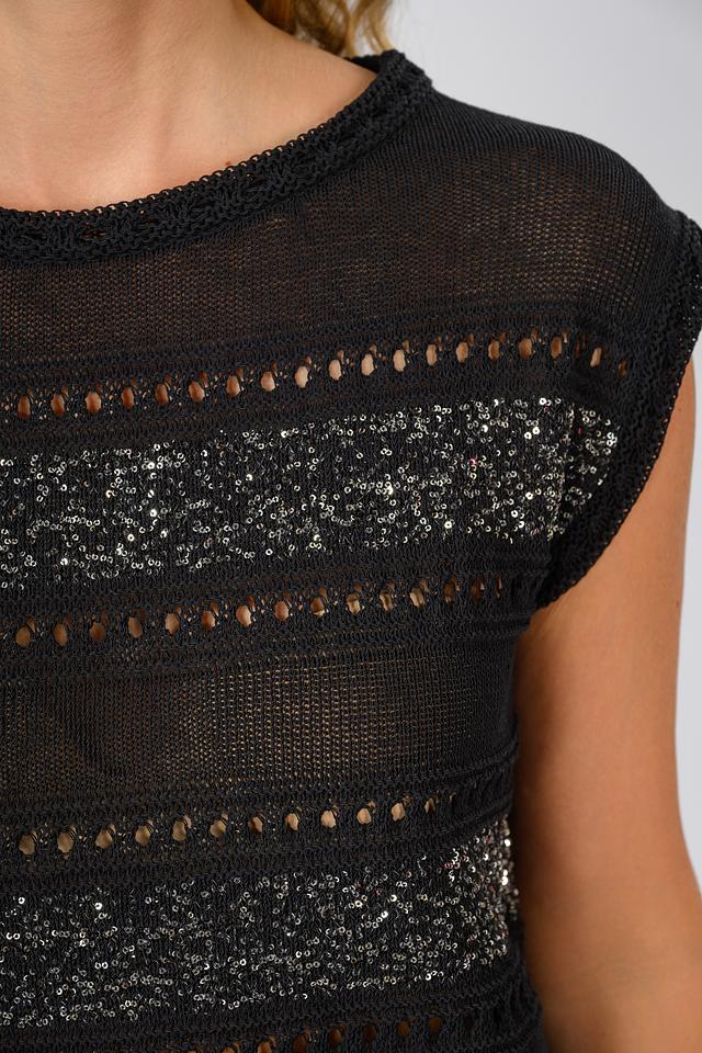 Чёрный джемпер от D. Exterior с короткими рукавами, украшенный полосами из пайеток и ажурным вязанием. Модель выполнена из мягкого хлопкового трикотажа с добавлением полиамида и полиэстера. Состав: хлопок 62%, полиамид 28%, полиэстер 10%