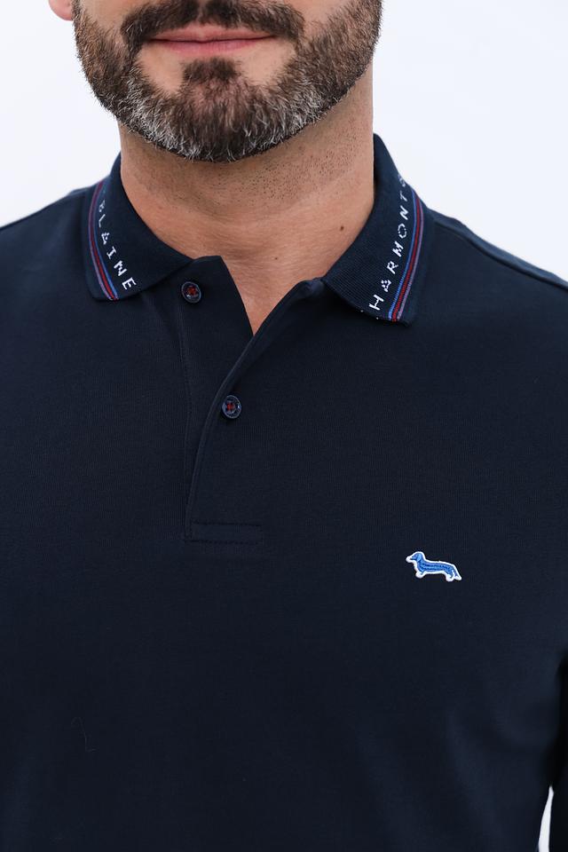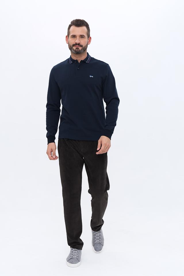 Модель имеет длинные рукава и воротник поло, что делает её универсальным элементом гардероба. На груди расположен небольшой логотип бренда, выполненный в контрастных цветах. Воротник поло дополнен тонкой полоской с логотипом бренда.