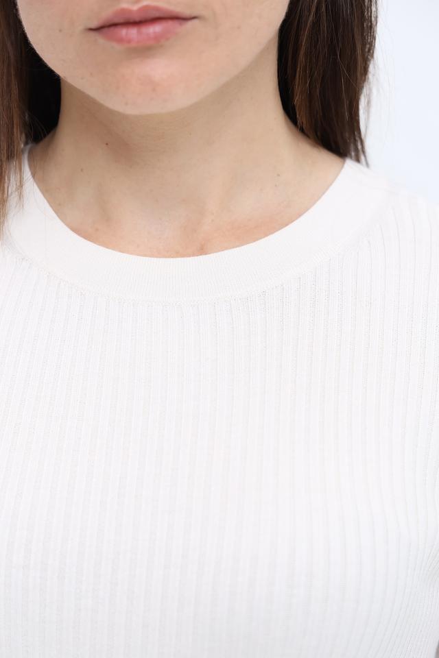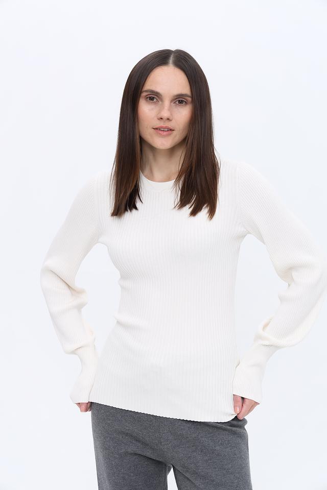 Джемпер имеет классический крой с круглым вырезом горловины и длинными рукавами. Рубчатая текстура придает изделию изысканность и подчеркивает его элегантный стиль. Преобладающий цвет – белый, что делает его универсальным и легко сочетаемым с другими элементами одежды.