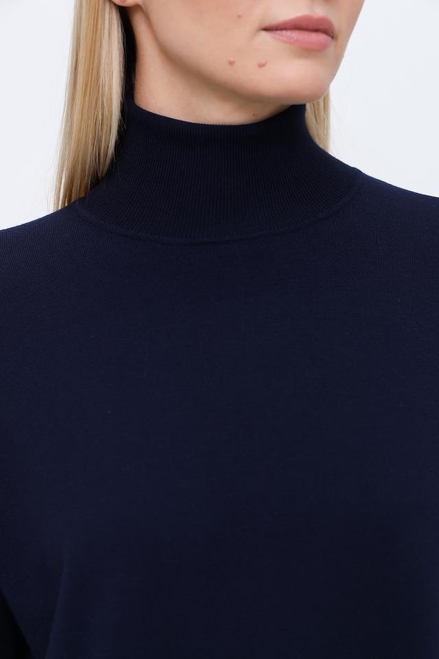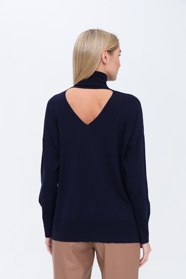 Особенностью модели является вырез на спине, который придает ей оригинальность и женственность. Джемпер имеет свободный крой, не сковывающий движений, и удобный воротник-стойка. Высокое содержание вискозы в составе обеспечивает мягкость и приятные тактильные ощущения.