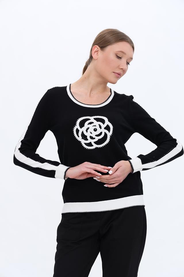 Этот джемпер от Leo & Ugo станет прекрасным дополнением к вашему образу. Он выполнен в классическом чёрном цвете и украшен крупным белым цветком, который придает ему особый шарм.