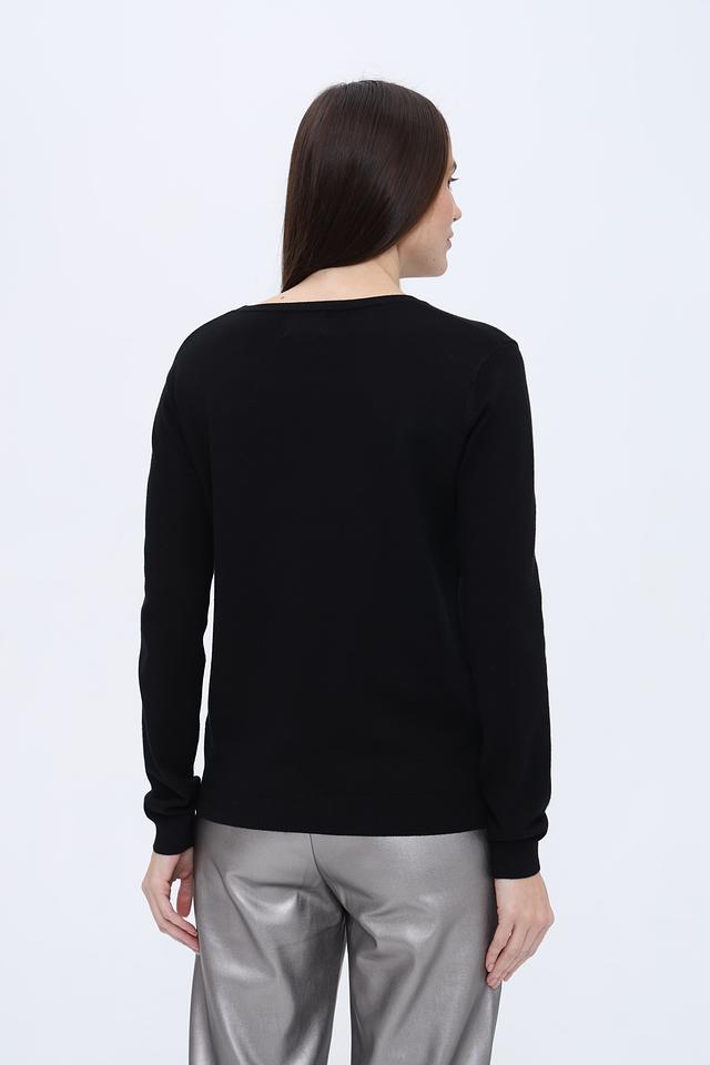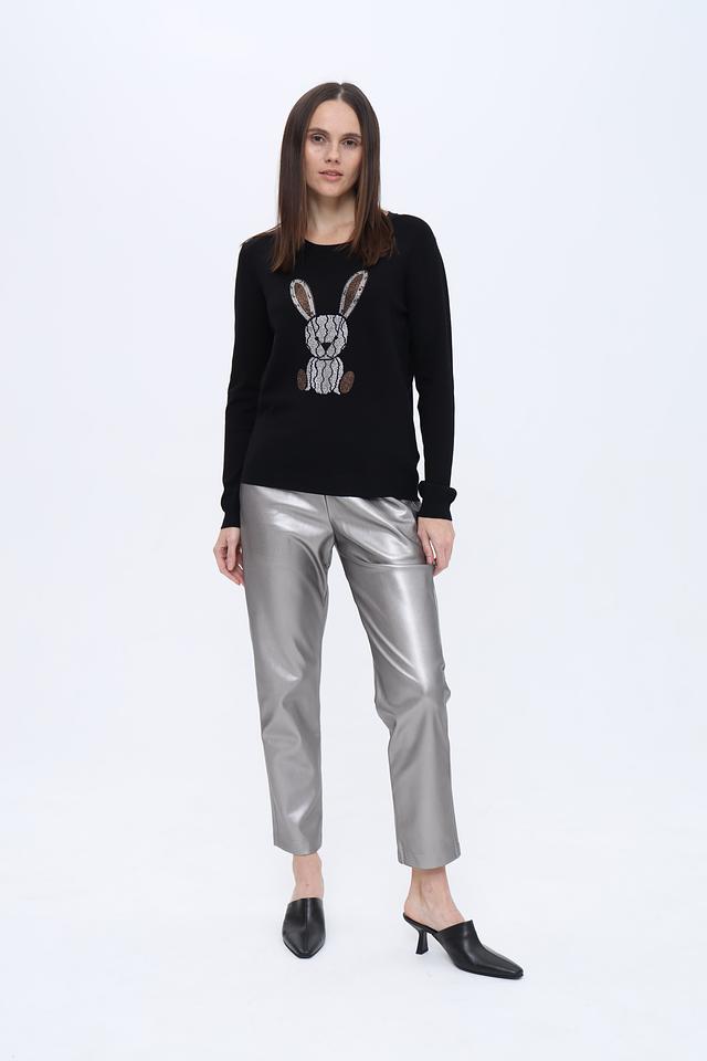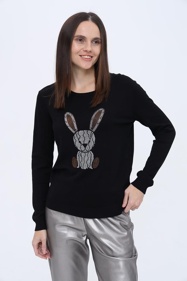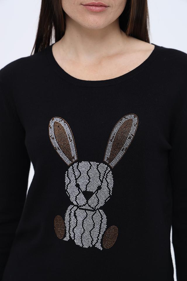 Чёрный джемпер Leo & Ugo с оригинальным декором в виде кролика, выполненным из страз. Модель имеет круглый вырез горловины и длинные рукава, идеально подходит для создания стильного повседневного образа. Состав: вискоза 79%, нейлон 21%