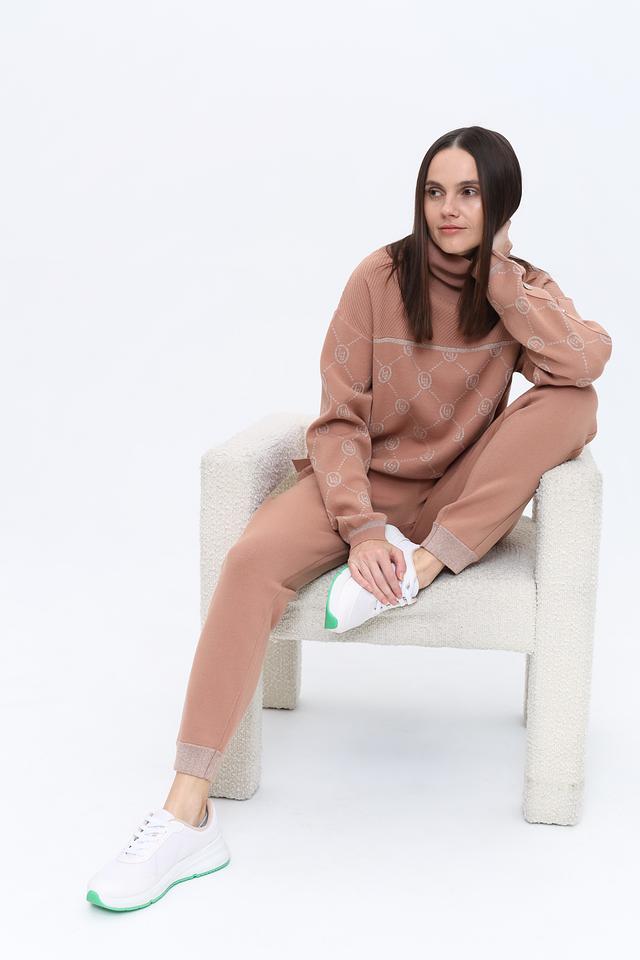 Джемпер имеет приятный бежевый оттенок и украшен узором в клетку, выполненным в светло-серых тонах. Высокий горловина добавляет образу изысканности, а рукава с небольшими декоративными пуговицами придают модели особый шарм.