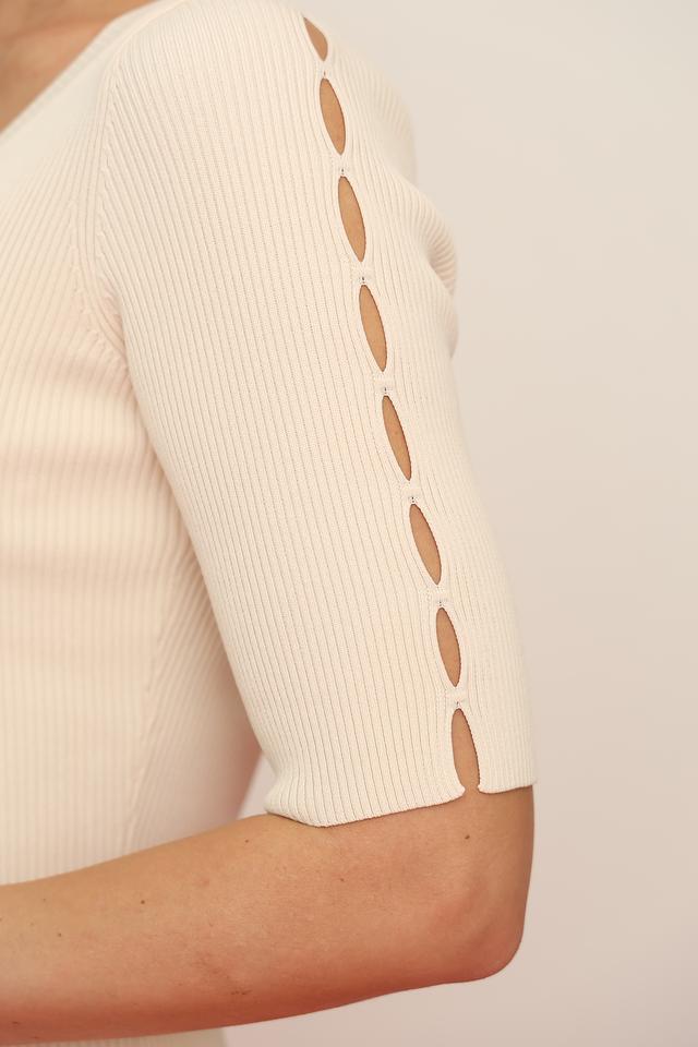 Джемпер имеет V-образный вырез, который визуально удлиняет шею и подчеркивает линию декольте. Короткие рукава с оригинальными вырезами добавляют изюминку и делают модель более интересной. Плотная вязка обеспечивает хорошую посадку по фигуре и сохраняет форму изделия.