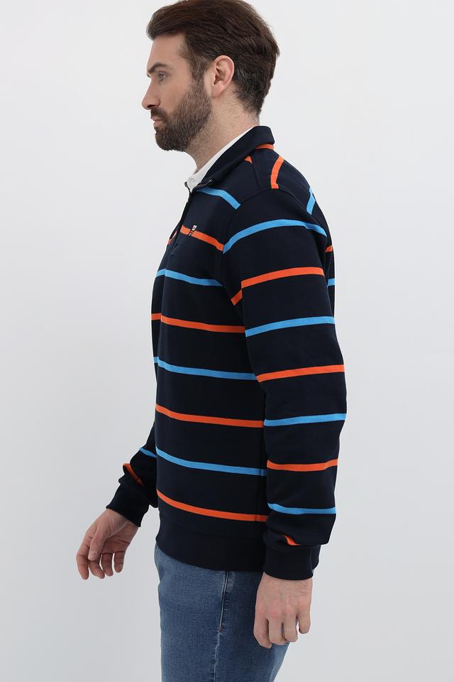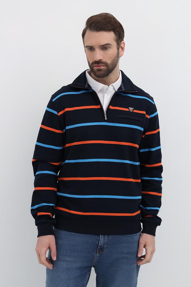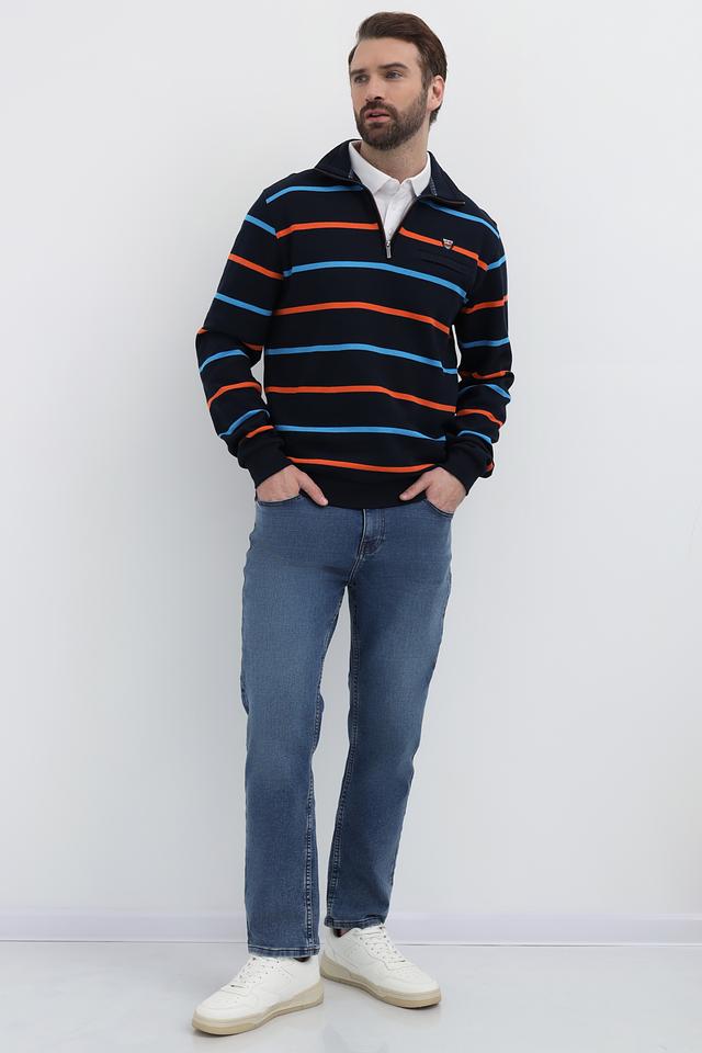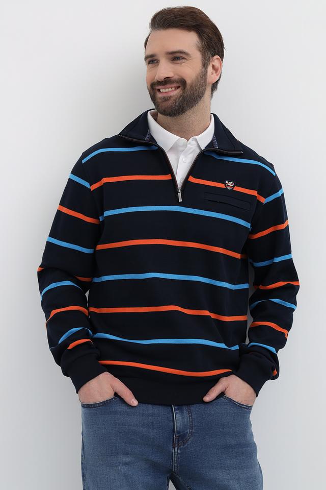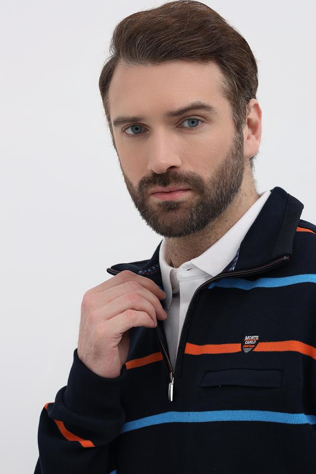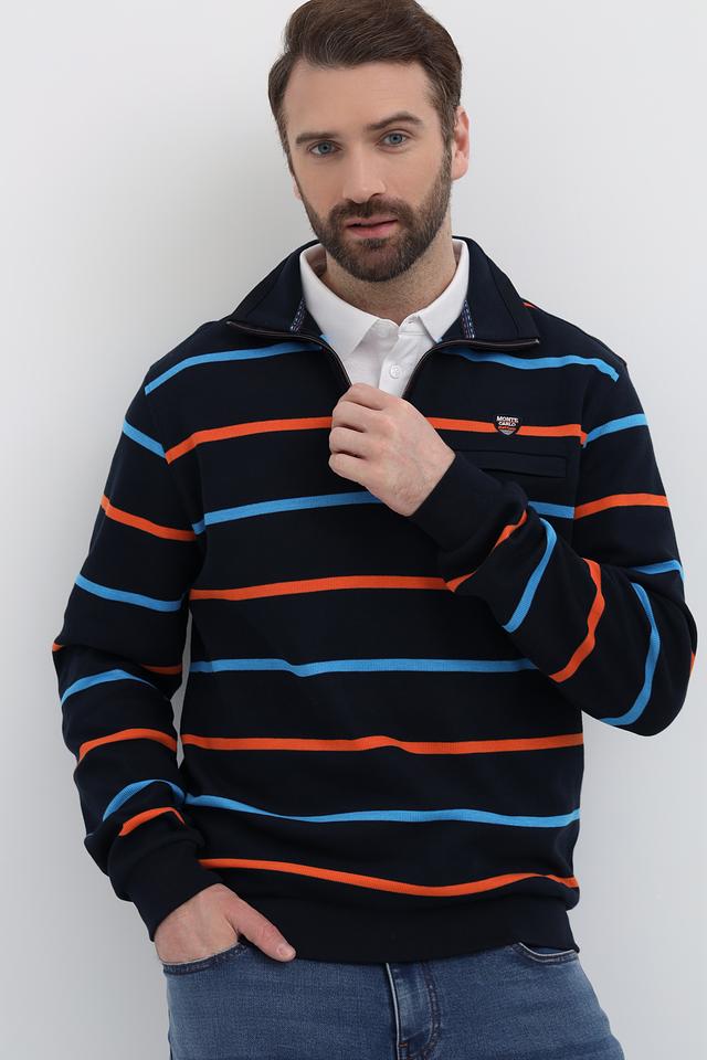 Мужской джемпер Monte Carlo синего цвета с яркими оранжевыми и голубыми полосами. Модель с воротником-стойкой и молнией, украшенная логотипом бренда. Изготовлен из мягкого и приятного к телу хлопка с добавлением полиэстера. Состав: хлопок 80%, полиэстер 20%
