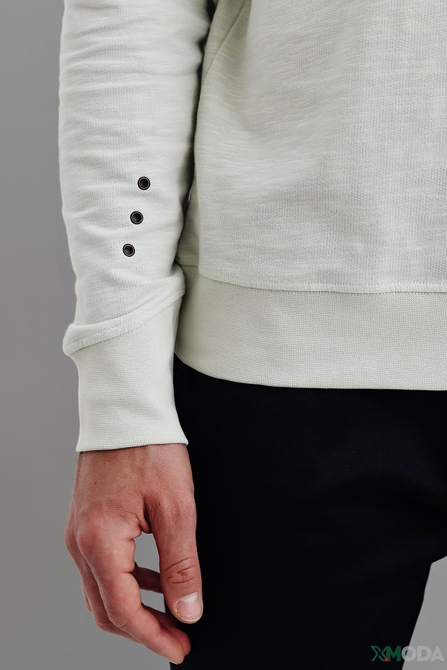 Джемпер имеет прямой крой, который не сковывает движения. Рукава и нижний край изделия оформлены манжетами, обеспечивающими плотное прилегание. На левом рукаве расположены три декоративные пуговицы.