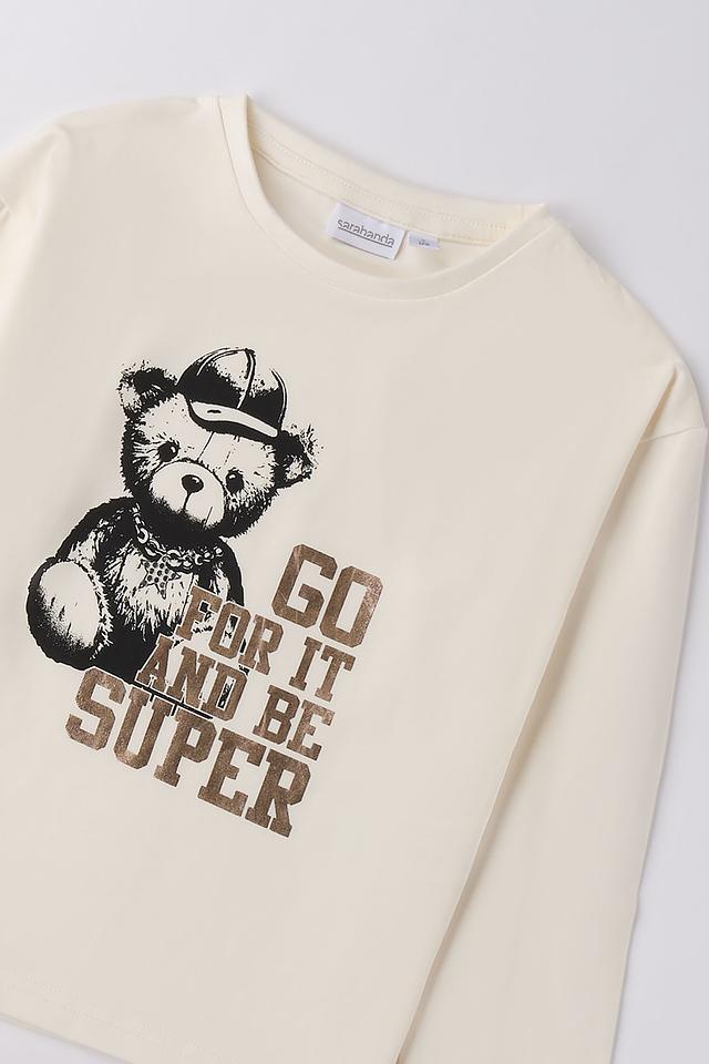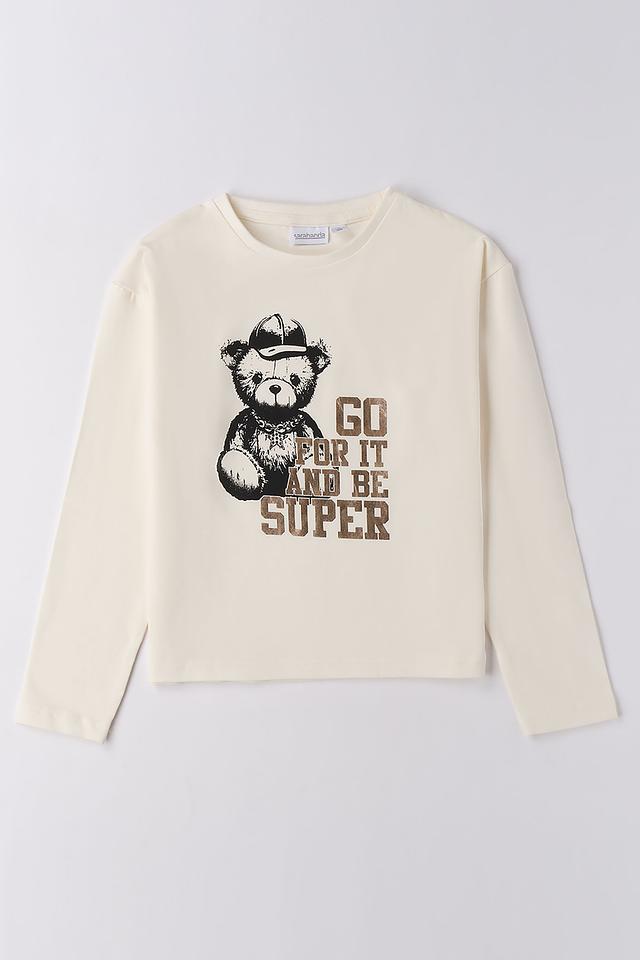 Этот очаровательный джемпер от Sarabanda станет отличным дополнением к гардеробу юной модницы. Выполненный в нежном кремовом цвете, он украшен забавным принтом с изображением медвежонка в кепке и вдохновляющей надписью.