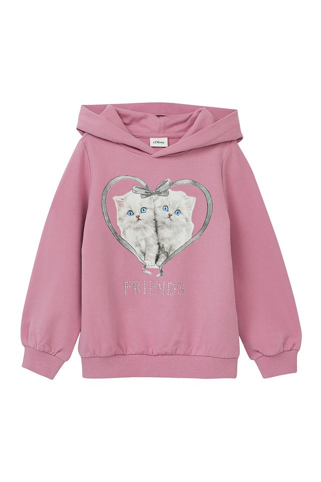 Детская толстовка s.Oliver нежно-розового цвета с очаровательным принтом котиков в форме сердца. Изготовлена из мягкого хлопка с добавлением эластана для комфорта и свободы движений. Состав: хлопок 95%, эластан 5%