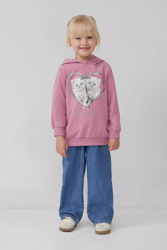 Толстовка имеет свободный крой, длинные рукава с манжетами и капюшон. Главная деталь – яркий и забавный принт с изображением двух котиков в форме сердца, украшенный блестками, который обязательно понравится юным модницам.