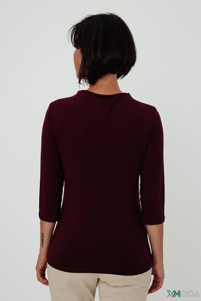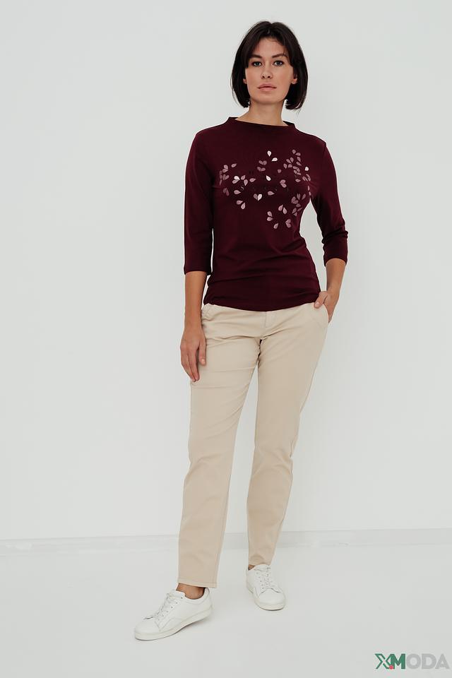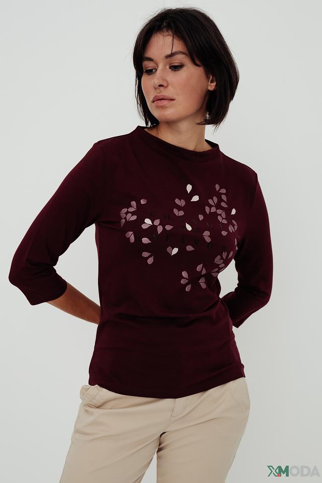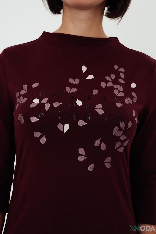 Джемпер имеет бордовый цвет и украшен оригинальным принтом в виде листьев, выполненным в более светлом оттенке. Круглый вырез горловины и рукава три четверти придают модели элегантный и женственный вид.