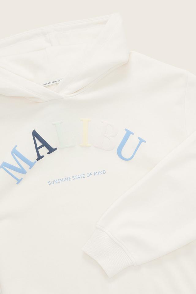 Худи имеет кремовый цвет, который легко сочетается с другими элементами одежды. На передней части расположена яркая надпись "MALIBU", выполненная в разноцветных тонах (синий, красный, голубой), что придает изделию игривый и запоминающийся вид. Под надписью размещена надпись "SUNSHINE STATE OF MIND".