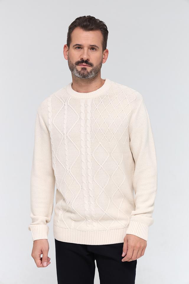Особенностью модели является рельефный узор из кос, придающий ей текстурность и оригинальность. Классический круглый вырез горловины и длинные рукава обеспечивают комфортную посадку. Джемпер имеет стандартный крой, подходящий для большинства типов фигур.