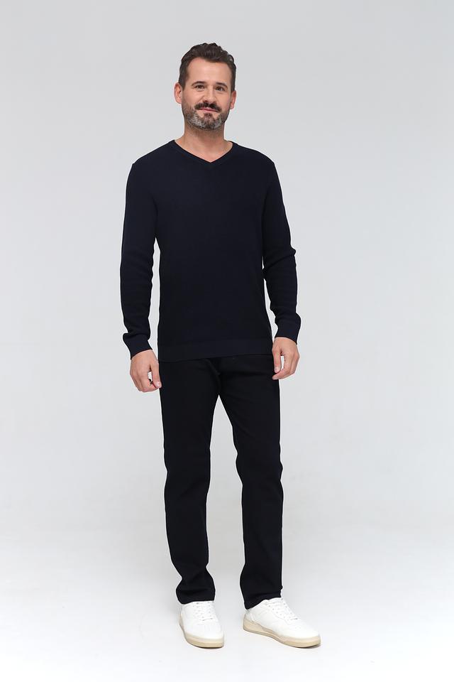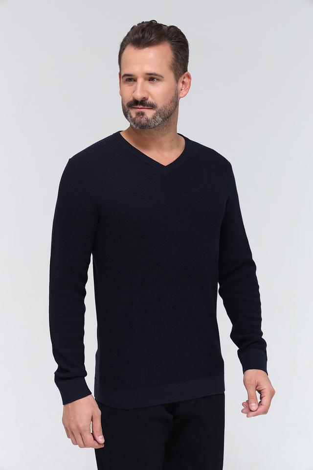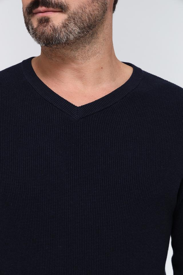 Джемпер имеет V-образный вырез, который придает ему элегантный и современный вид. Тёмно-синий цвет делает его универсальным дополнением к любому гардеробу, легко сочетается с различными стилями одежды.