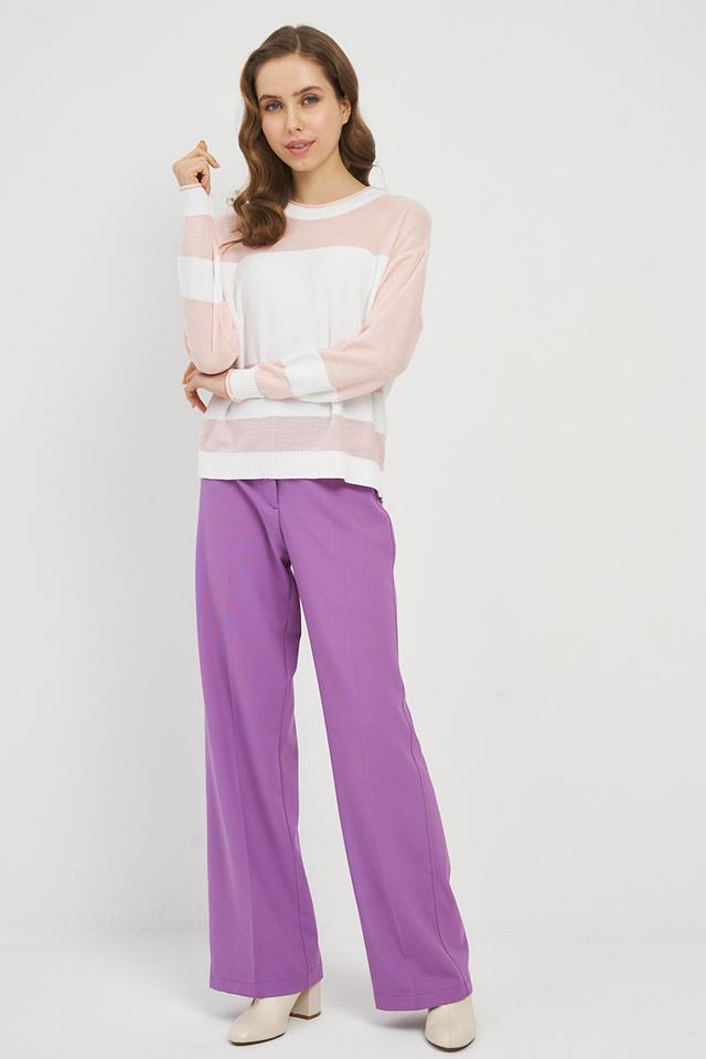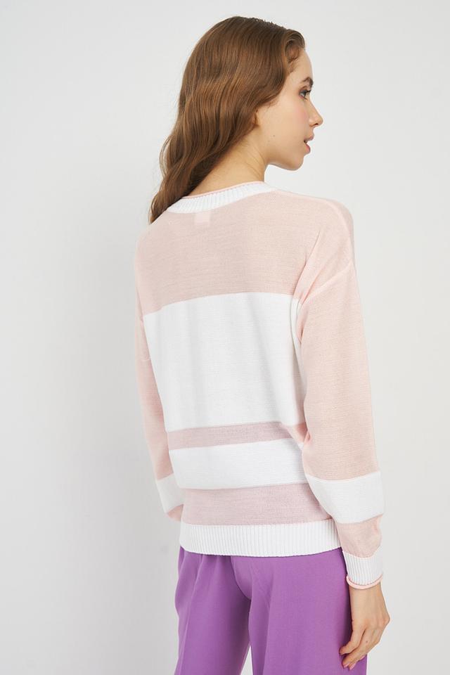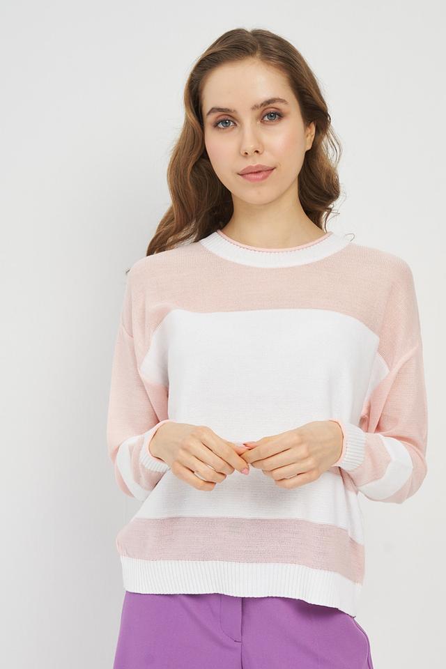 Этот джемпер от VAY станет отличным дополнением к вашему гардеробу. Он выполнен в нежном розовом цвете с контрастными белыми полосами, что придает ему свежий и современный вид.