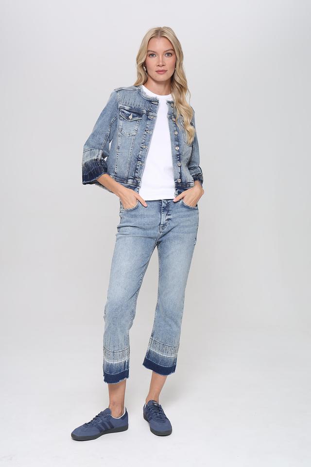 Модель имеет классический крой с рукавами три четверти, что делает ее универсальной для любого времени года. Отличительной особенностью жакета является эффект потертости и градиентный переход цвета на рукавах, добавляющие ему оригинальности и стиля.