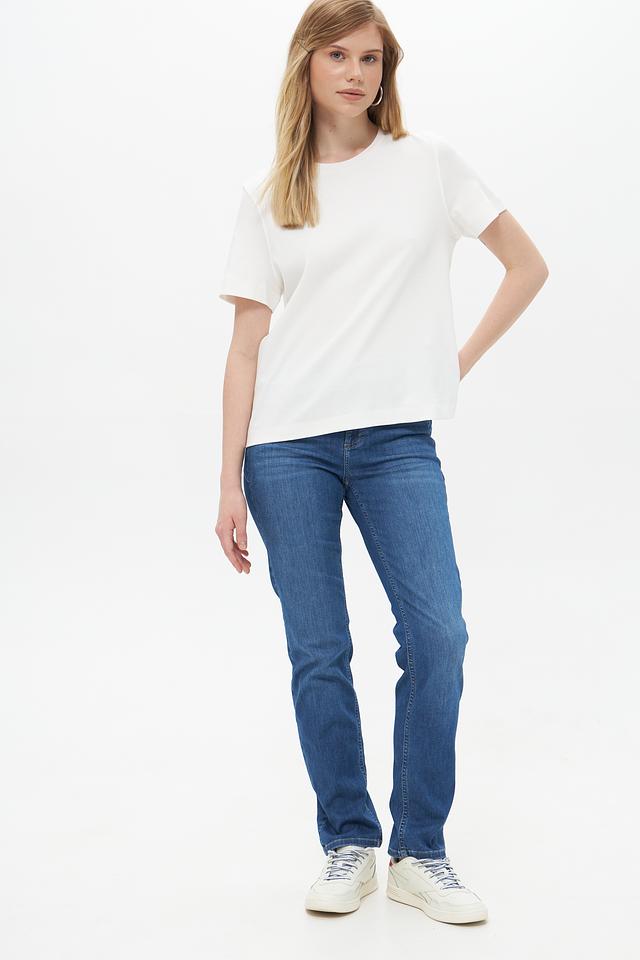 Классический крой с пятью карманами и стандартной посадкой обеспечивает удобную посадку по фигуре. Джинсы имеют умеренную степень потертости, что придает им актуальный и стильный вид.