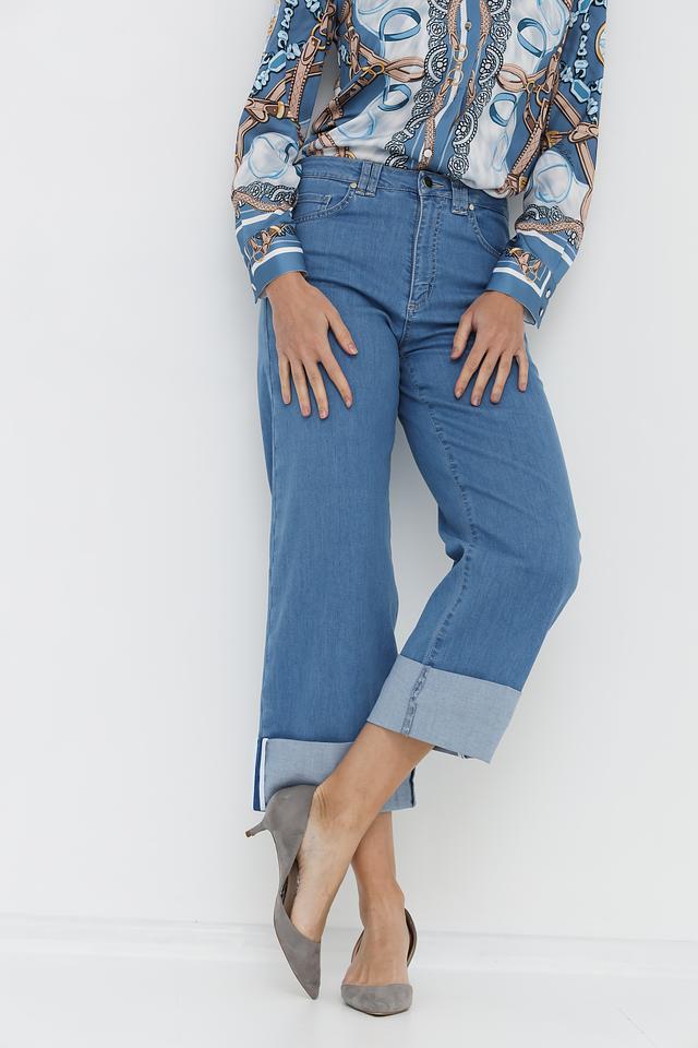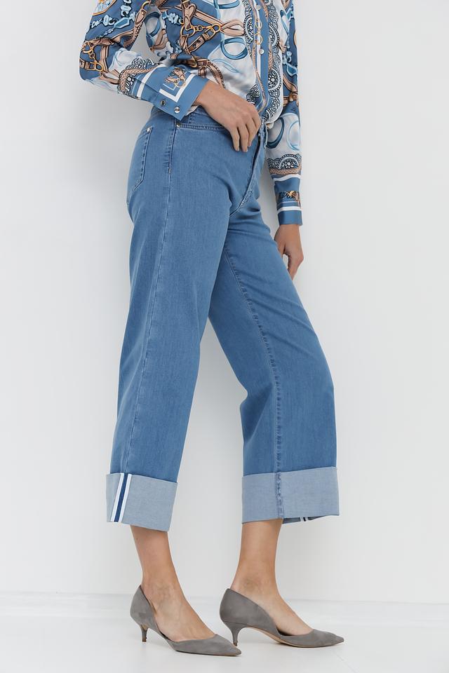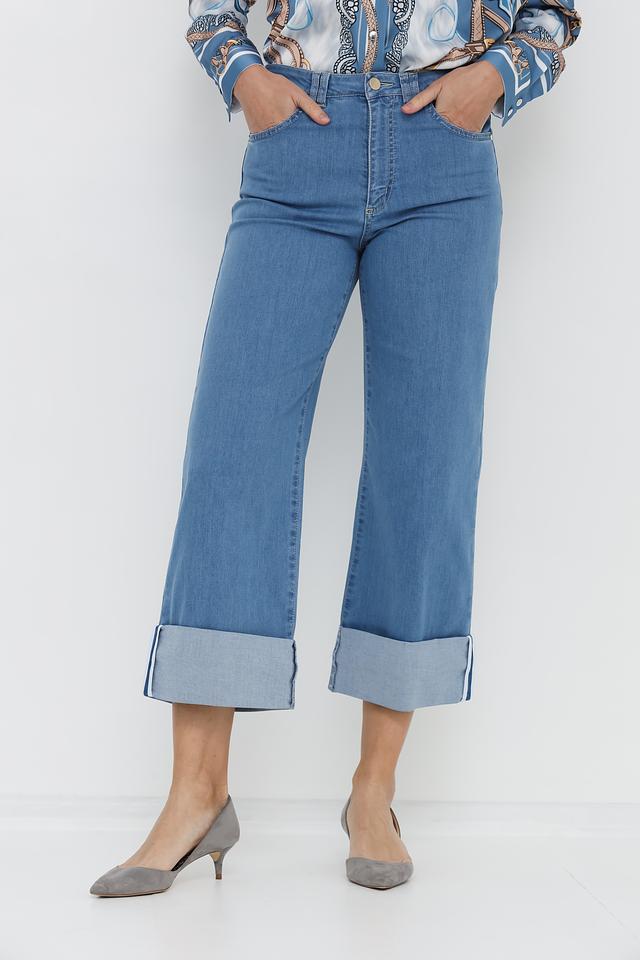 Особенностью данной модели являются широкие штанины, которые сужаются к низу, создавая эффект кюлотов. Подвернутые штанины добавляют образу оригинальности и непринужденности. Классическая посадка и пятикарманный крой делают эти джинсы универсальными и подходящими для различных типов фигуры.