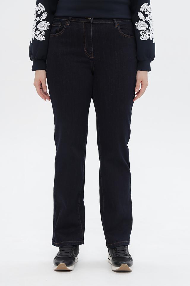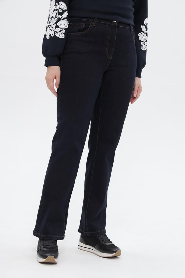 Джинсы имеют высокую посадку и классический клёш, что визуально удлиняет ноги и создает элегантный силуэт. На задних карманах присутствует декоративная строчка, подчеркивающая стиль и индивидуальность изделия. Тёмно-синий цвет делает эти джинсы универсальным элементом гардероба, который легко сочетается с различными видами верха.