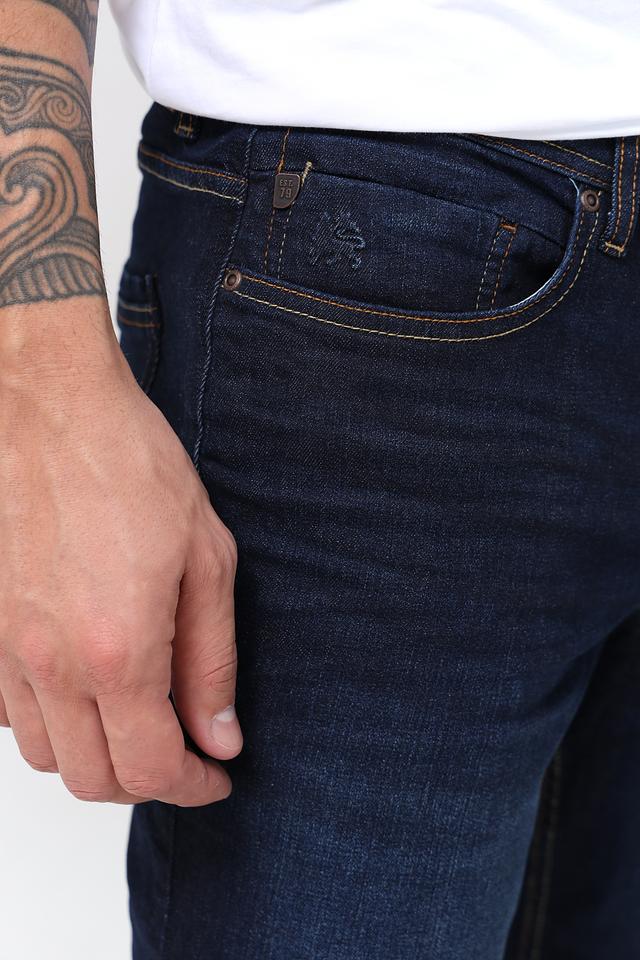 Застёжка на металлическую пуговицу и молнию. Пять карманов – два передних, два задних и один небольшой карман для мелочи. Тёмно-синий цвет джинсов дополнен контрастной отстрочкой швов. Данная модель станет отличным дополнением к вашему повседневному гардеробу.