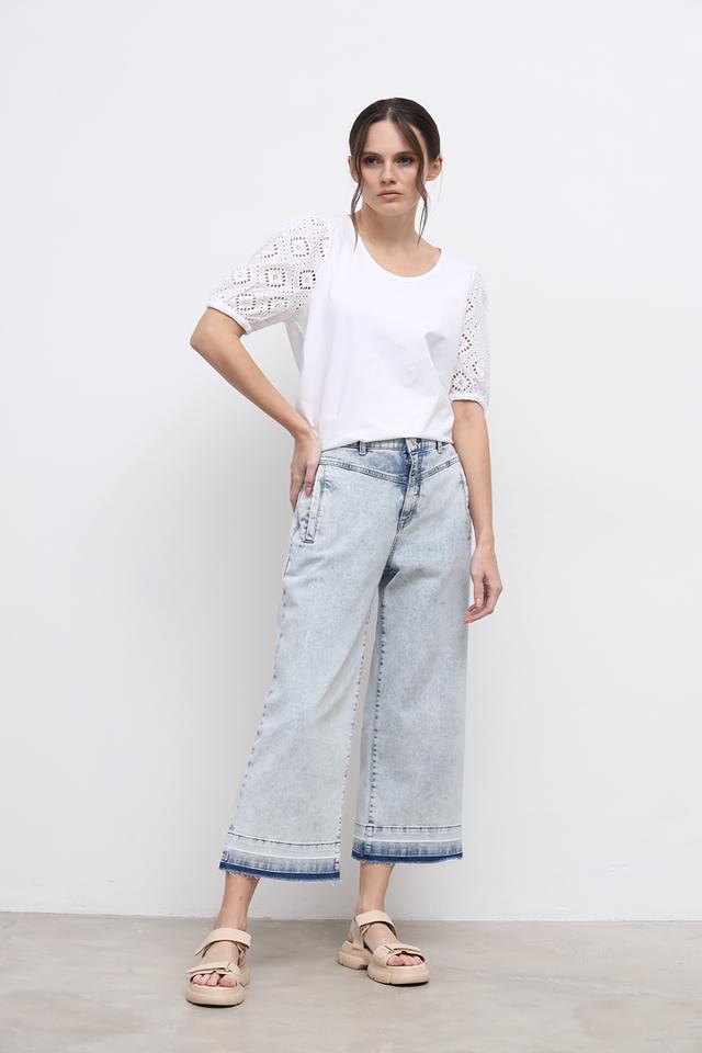 Джинсы Marc Cain светло-голубого цвета – это стильная модель укороченного кроя с эффектом потертости. Изготовлены из качественного хлопка с добавлением эластана для комфортной посадки и свободы движений. Состав: хлопок 92%, эластомультиэстер 6%, эластан 2%