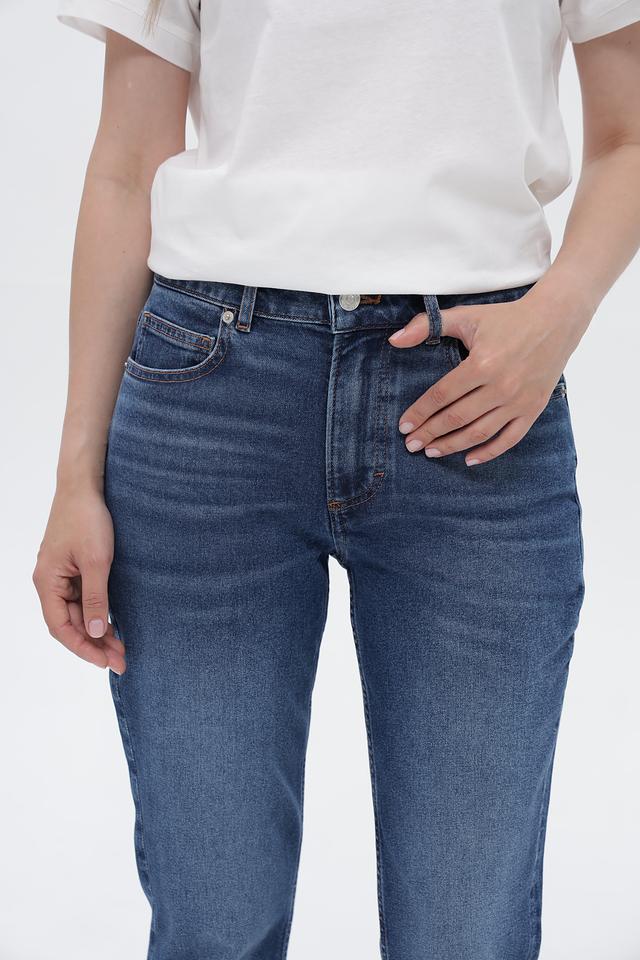 Джинсы имеют высокую посадку, подчеркивающую талию, и широкую штанину, начинающуюся от бедра. Пять функциональных карманов обеспечивают практичность. Обработка денима создает эффект легких потертостей, придавая джинсам винтажный вид.