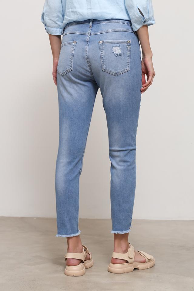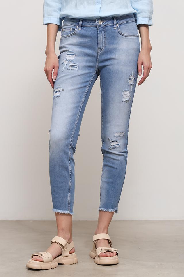 Голубые джинсы Monari с эффектными рваностями и необработанным краем – стильное и комфортное решение для повседневного образа. Модель выполнена из качественного хлопка с добавлением полиэстера и эластана, обеспечивающих удобную посадку и долговечность. Состав: хлопок 90%, полиэстер 7%, эластан 3%