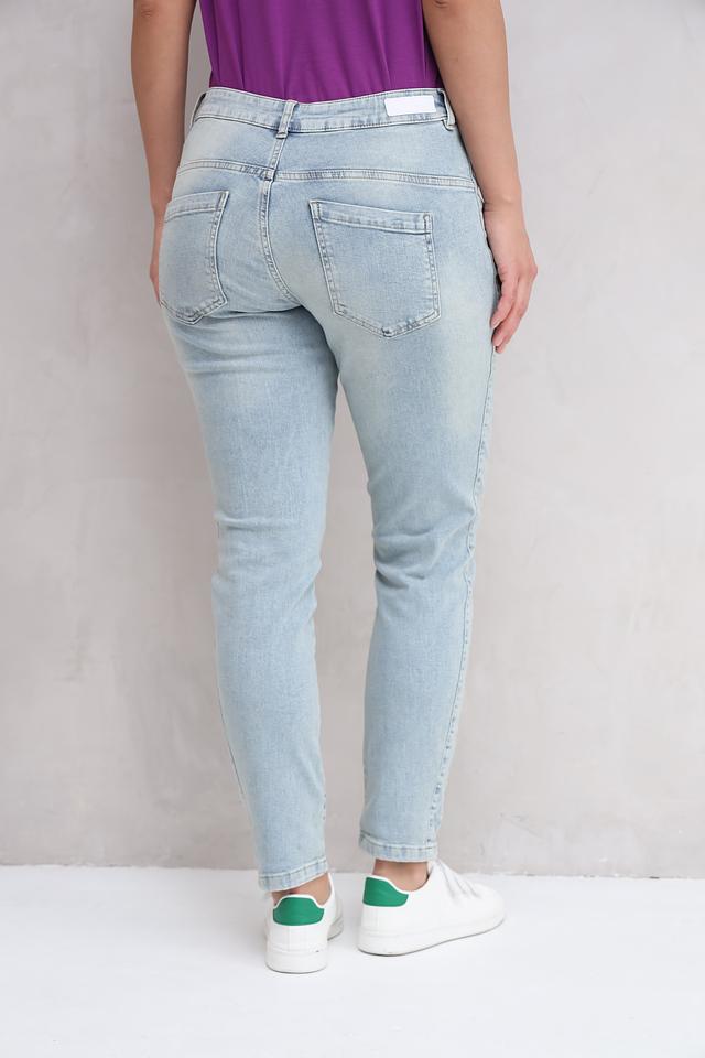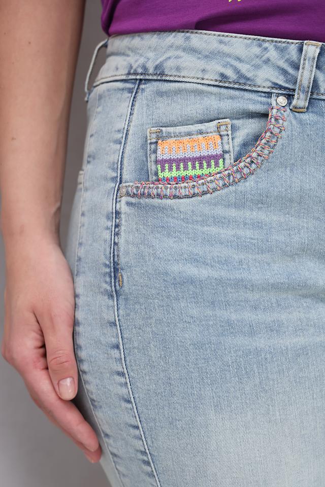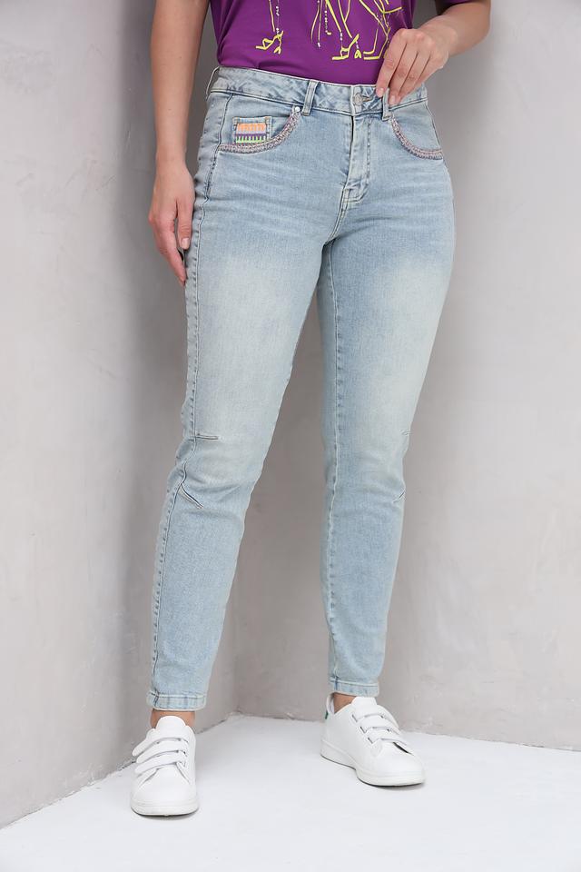 Женские джинсы Oui голубого цвета с эффектом потертостей и декоративными элементами. Модель выполнена из хлопка с добавлением эластана для комфортной посадки и свободы движений. Состав: хлопок 92%, эластан 8%